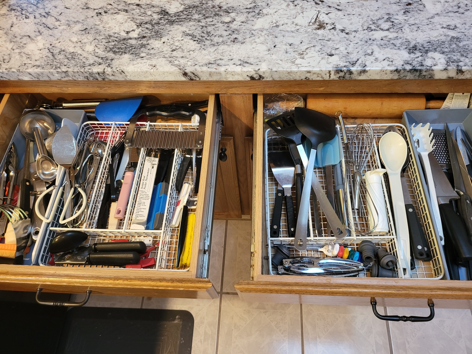 Two drawers full of useful kitchen utensils, gadgets and knives.