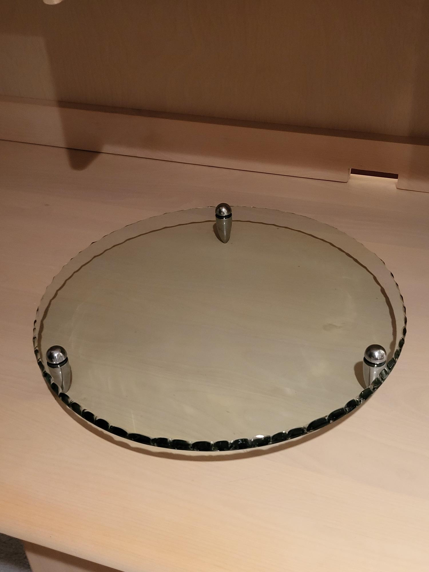 Pie crust edge 14" cheese platter with three modern/space age looking stainless steel feet.