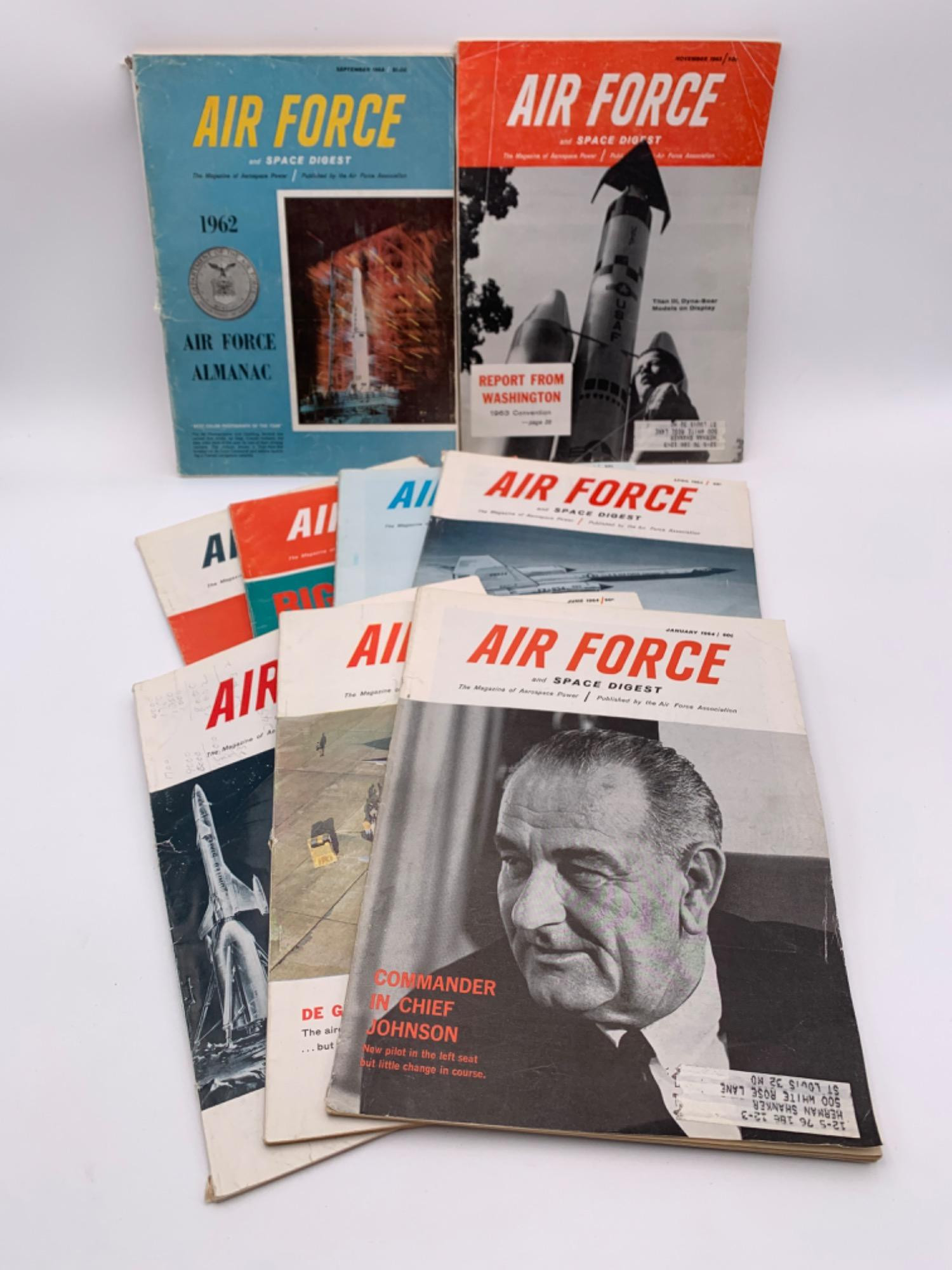 This lot consists of 10 total magazines. There are 9 single issues of Air Force and Space Digest; 4 from 1963
