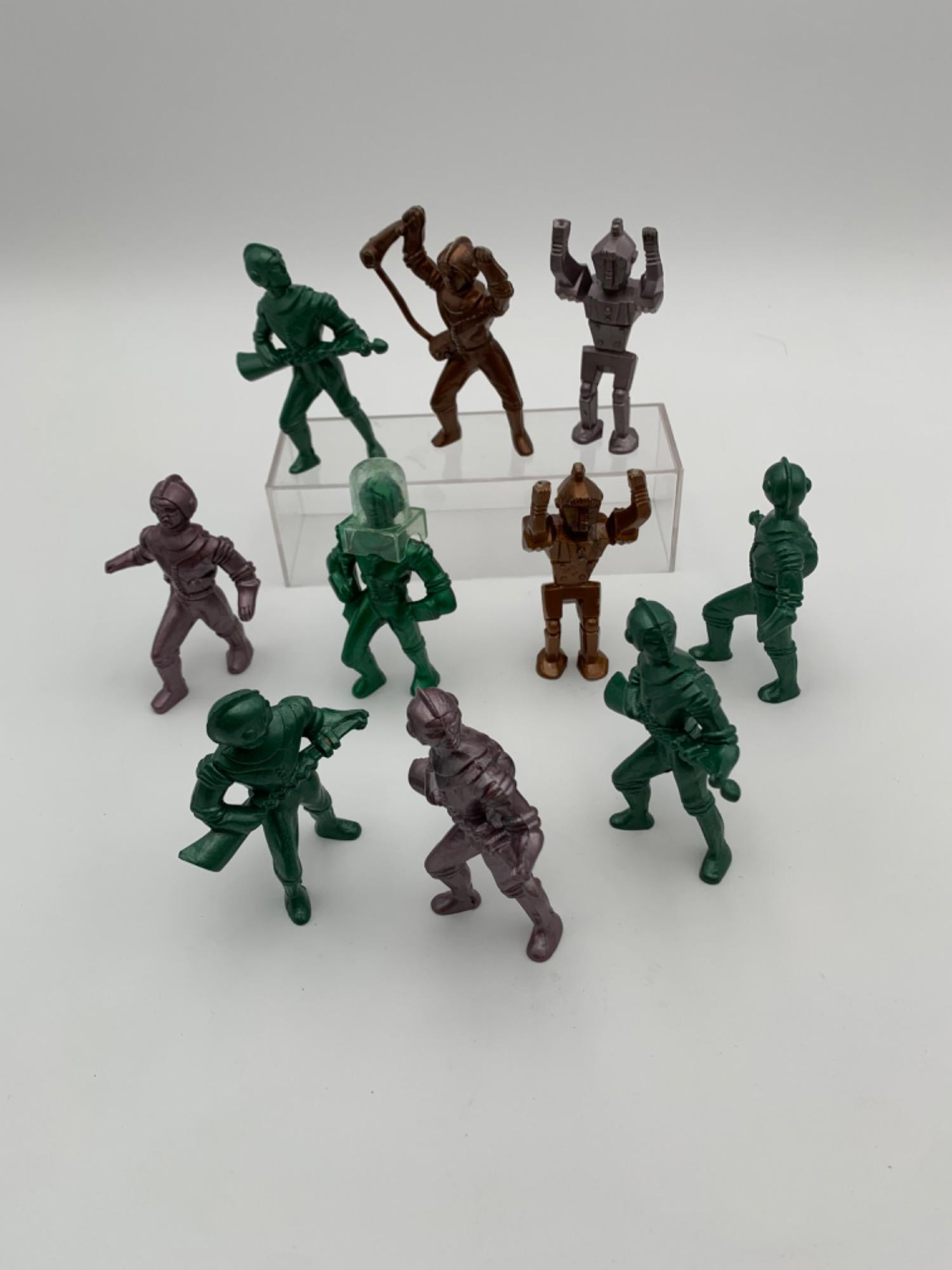 hard plastic in green, brown, and lilac. One figure has a helmet. 10 figures in