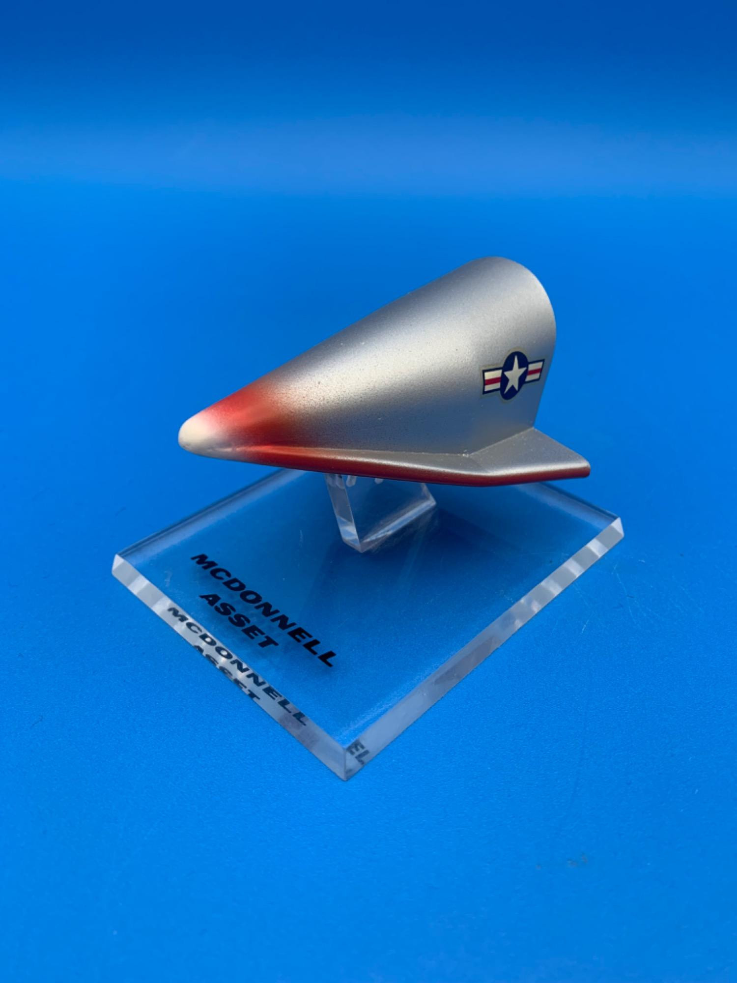 Desktop model of McDonnell's Dyna-Soar Re-entry Vehicle with USAF livery. We believe this is a relatively rare 1960s model from Topping although there is no maker's label present. In grey with red & yellow underneath to simulate re-entry. This small model was created when the company was verifying the heat shields on the Dyna-Soar X-20 project vehicle. This model is heavy for its size, so we believe it is solid resin. Mounted on a clear Lucite base labeled in black "McDonnell Asset". In excellent overall condition with a small scrape above the logo - see last photo. CORRECTION TO THE ABOVE: Many thanks to one of our expert bidders for the heads up: the above description is not totally accurate. The model is not of the re-entry vehicle itself, but actually from the ASSET program. He was kind enough to provide us with the link with the correct information :https://en.wikipedia.org/wiki/ASSET_(spacecraft)