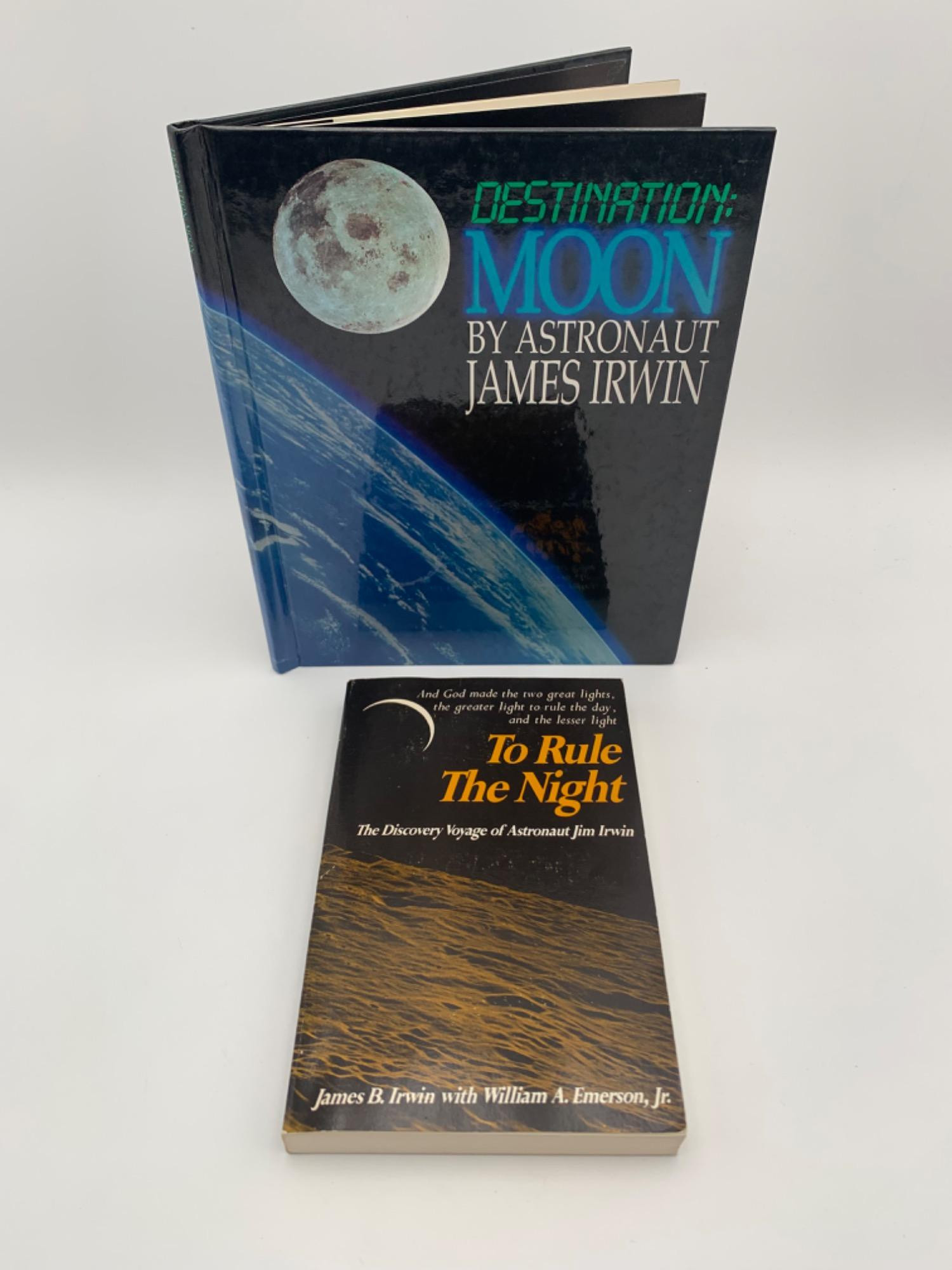 2 spaceflight books by James Irwin for very different audiences: one for the young set and one for the older set. DESTINATION MOON by James Irwin with Al Janssen. Signed