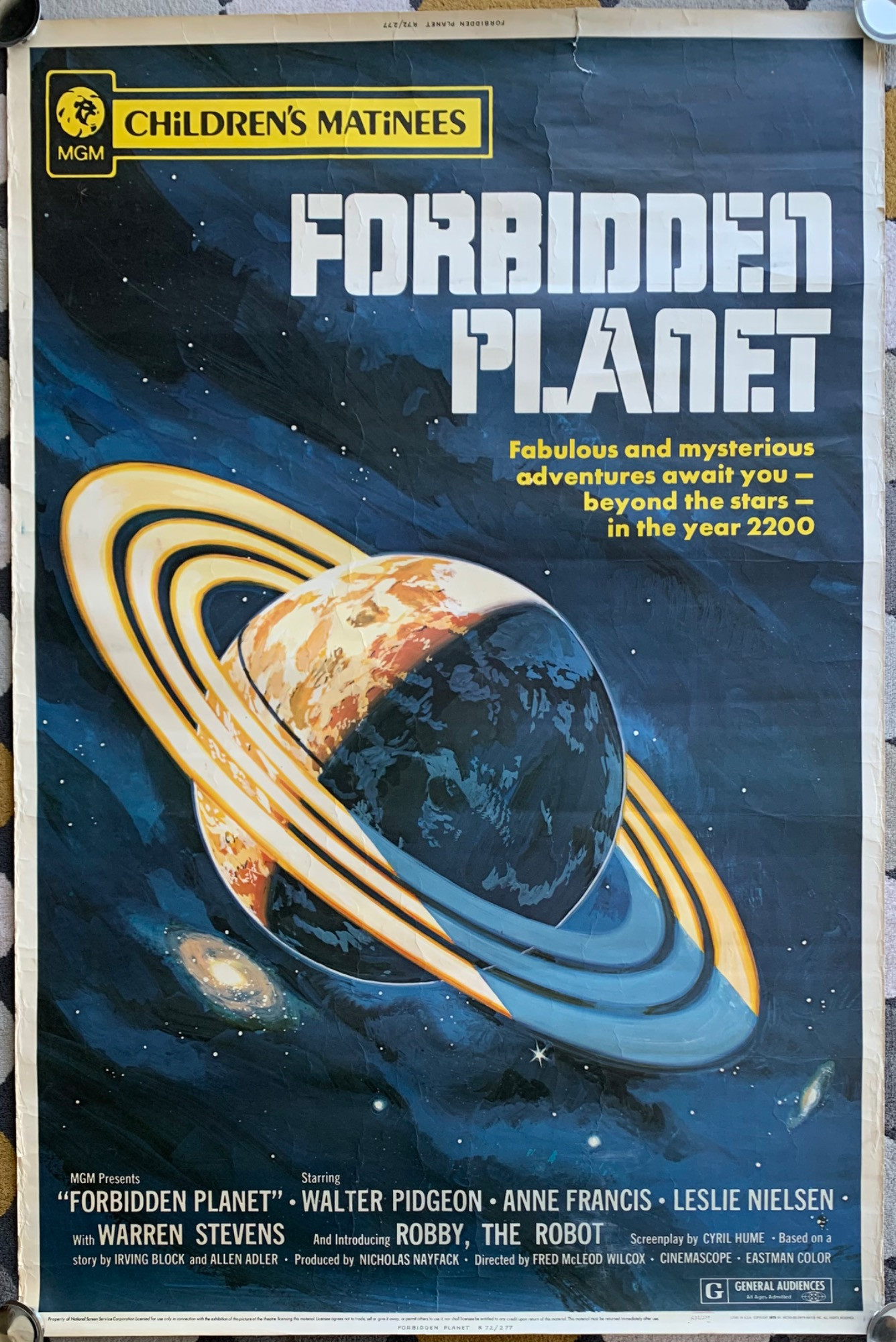 Wonderful HUGE movie lobby poster for 'Forbidden Planet' starring Walter Pigeon & Leslie Neilsen. From MGM's Children's Matinee Series. The movie was made in 1956 and shown as part of a family series of movies at theatres during 1972. This poster is was made to promote the kids' series in 1972 - but the image is from the original movie. It is in decent used vintage shape; it is printed on heavy off-white paper/tag and has a number of issues along the edges & crinkling. Please see the photos for closeups typical of the edge condition. However, it still shows very well and we think of the wrinkles & frayed edges as a display of love over the years - except for the 2" rip in the top center, of course - see last photo. We think it would be great under glass with a frame for a wall-size piece of colorful art.
