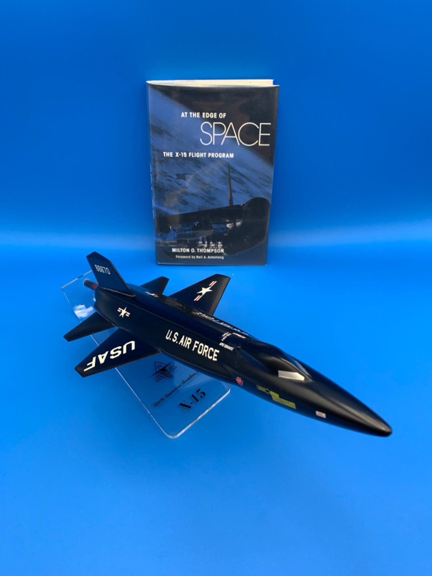 Desktop model & book pairing: Desktop model of North American Aviation's X-15 Rocket Plane. US Air Force livery and LOTS of detailed decals. Single pillar mount on a clear Lucite base with the NAA's logo and the plane name in black. Decals are in terrific condition as is model overall with only a couple of minor flaws to note: plastic is a bit misshapen at rear exhaust & small scrape on belly that doesn't show unless turned upside down - see last 2 photos for details. AT THE EDGE OF SPACE by Milton O. Thompson (foreword by Neil Armstrong). Hardcover dustjacket/plastic protector. 1992, first edition, Smithsonian Press (Washington DC). 375 pages. In excellent condition - may never have been read.