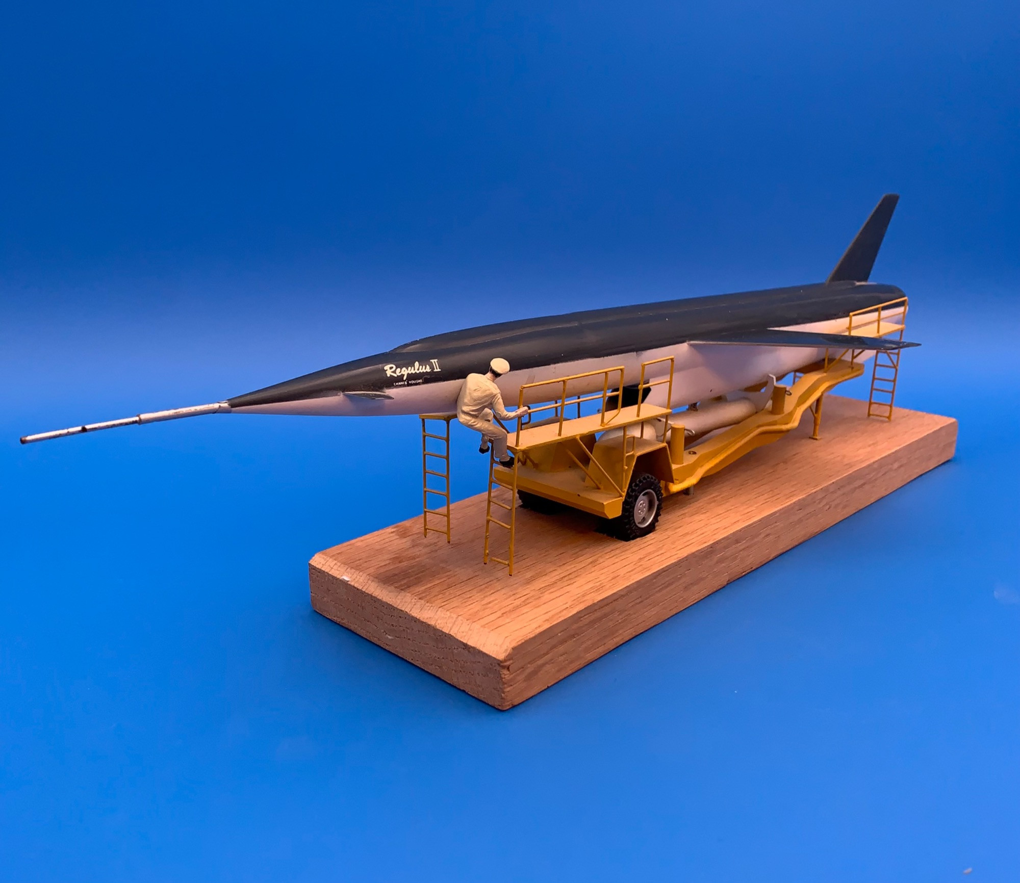 Desktop model of the Chance Vought Regulus II cruise missile. Very nice but extremely delicate model; mounted to a wood block. Yellow metal trolley with support structure under the grey and white plastic missile. We love the worker climbing the ladder! This particular model looks good, but is quite fragile - please note the following flaws: a couple wires on ladders/supports have come loose - thus they are very prone to breaking (we do have the crossbar for the ladder - it will come taped to the wooden base if you wish to glue it back into place). Also please note that there is some wear on one wing and what appears to be small white paint flecks here and there on the fuselage (very slight, but we want to be totally transparent). If this is shipped, it will definitely require special handling as the yellow ladders feel like they will break just looking at them!. See last three photos for most obvious issues.