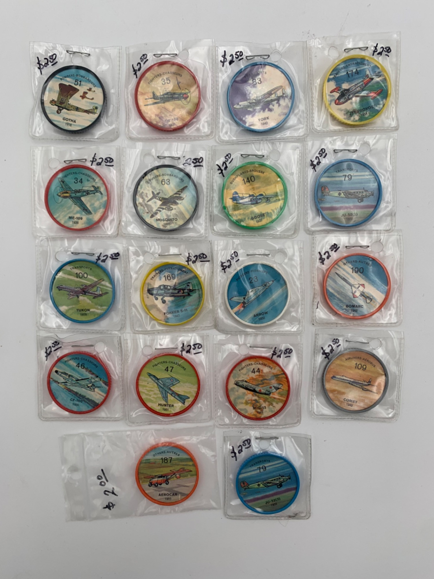 Premium awards from JELL-O and Hostess - early 1960s. This lot consists of 18 (including 2 duplicates of #79) from the "Famous Aircraft of the World" series. They measure approx. 1.25" W with an airplane on the front and a plastic disk on the back with Hostess/JELL-O imprinted.