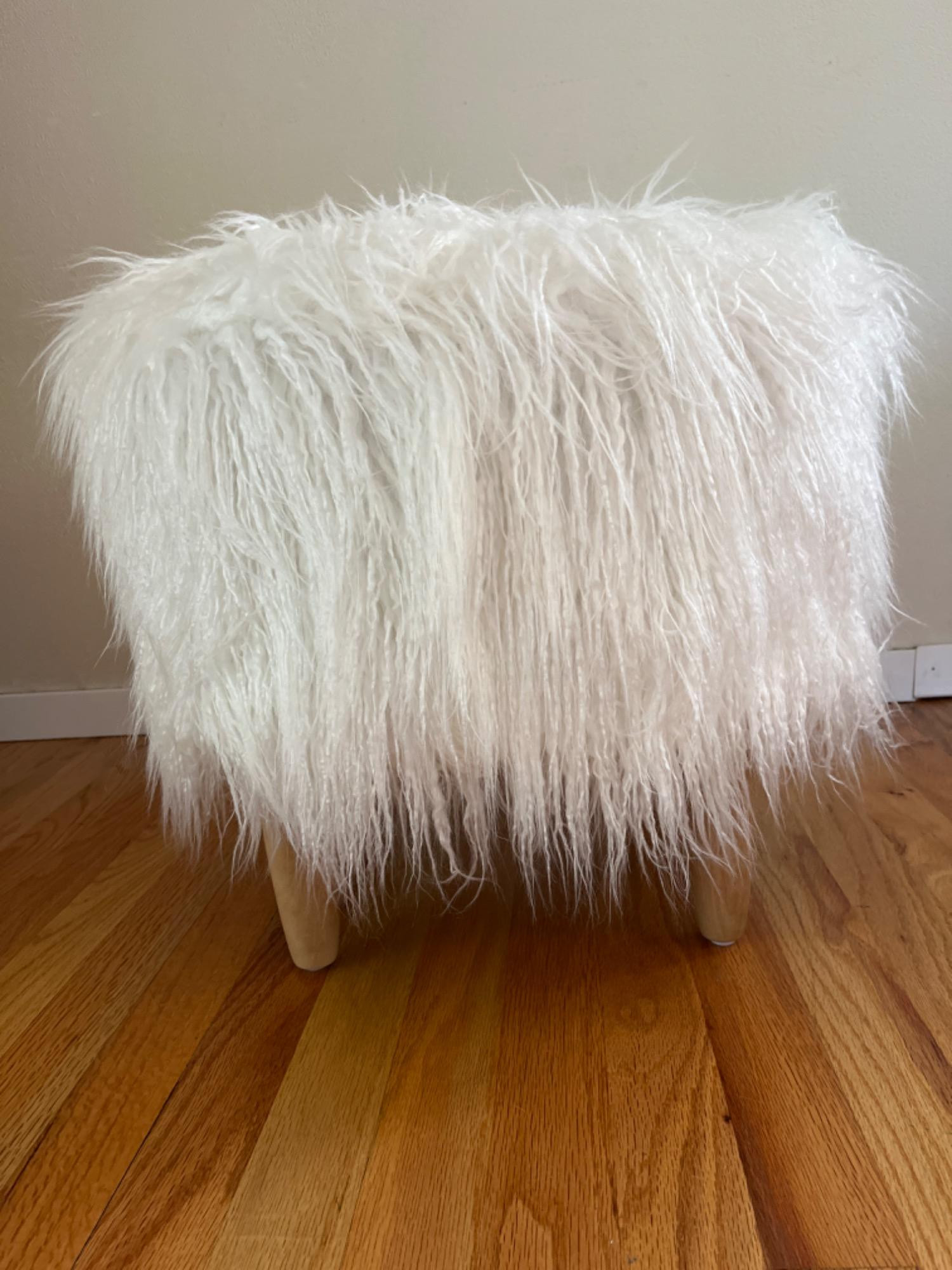 Holley Mongolian Fur Ottoman from Threshold - cream Dia.: 18” 16”H Very sturdy wooden frame and legs w/ protective caps on bottom Add a soft, cozy touch to any room with this ottoman. It is upholstered in cream faux fur fabric and can be used as a footstool or an extra seat