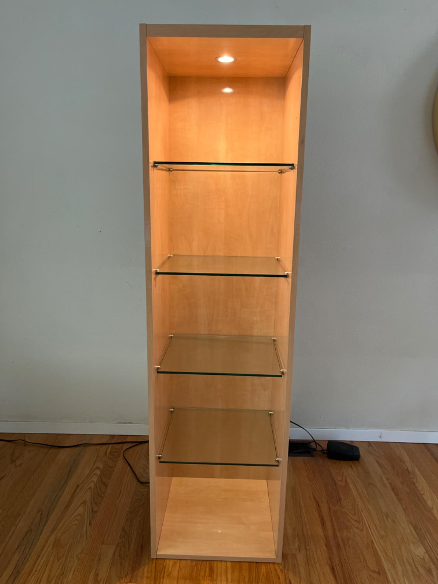 Italian Made Lighted Display Shelf #1 This is a composite wood display cabinet with adjustable glass shelves. The adjustability of the shelves lends itself to endless possibilities for the items you can display. The light mounted on the inside of the top shines through the shelves highlighting your items displayed. This is one of two available. If you are looking to create 2 similar display spaces see Lot #17 for the matching cabinet. Stamped on back - Made in Italy. Bidding on this lot is an agreement that: (1.) You