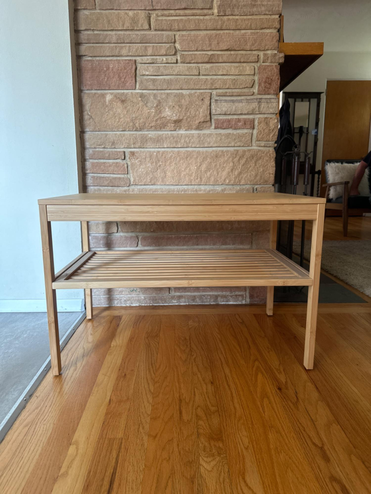 IKEA Nordkisa Bamboo Bench #1 This bench can double as a table and can be used in any room. Put it at the end of your bed or use it as a coffee table. There is wonderful extra storage space on the shelf below perfect for holding a folded blanket, quilt or shoes. Maximum wight capacity 250 lbs. Bidding on this lot is an agreement that: (1.) You