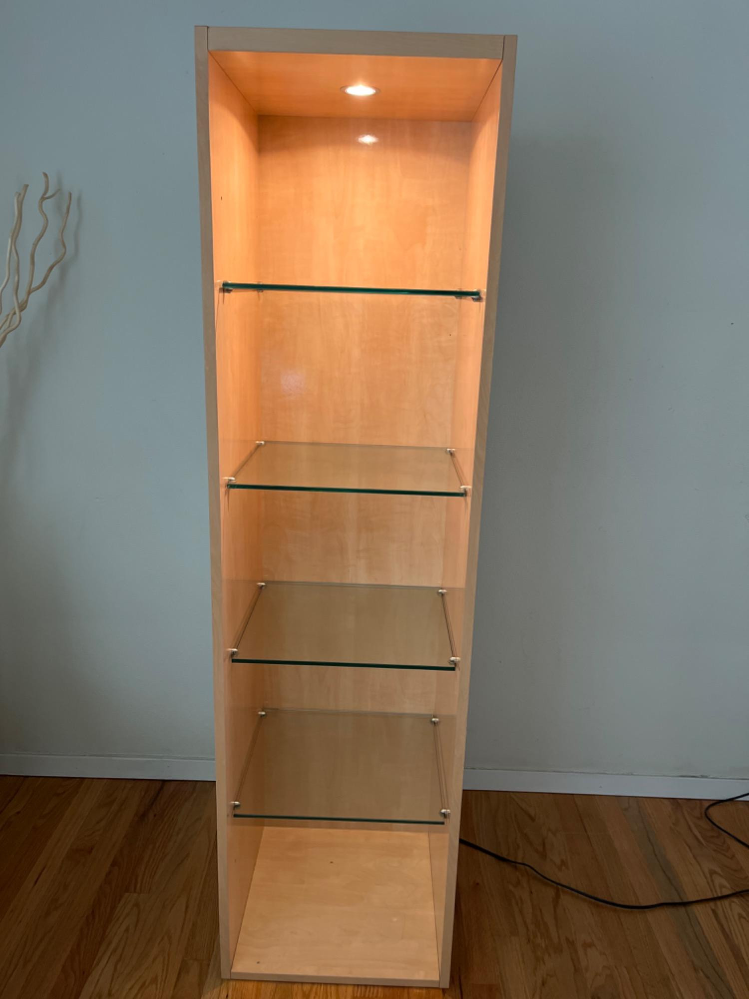 Italian Made Lighted Display Cabinet #2 This is a composite wood display cabinet with adjustable glass shelves. The adjustability of the shelves lends itself to endless possibilities for the items you can display. The light mounted on the inside of the top shines through the shelves highlighting your items displayed. This is the second of two available. If you are looking to create 2 similar display spaces see Lot #14 for the matching cabinet. Stamped on back - Made in Italy. Bidding on this lot is an agreement that: (1.) You