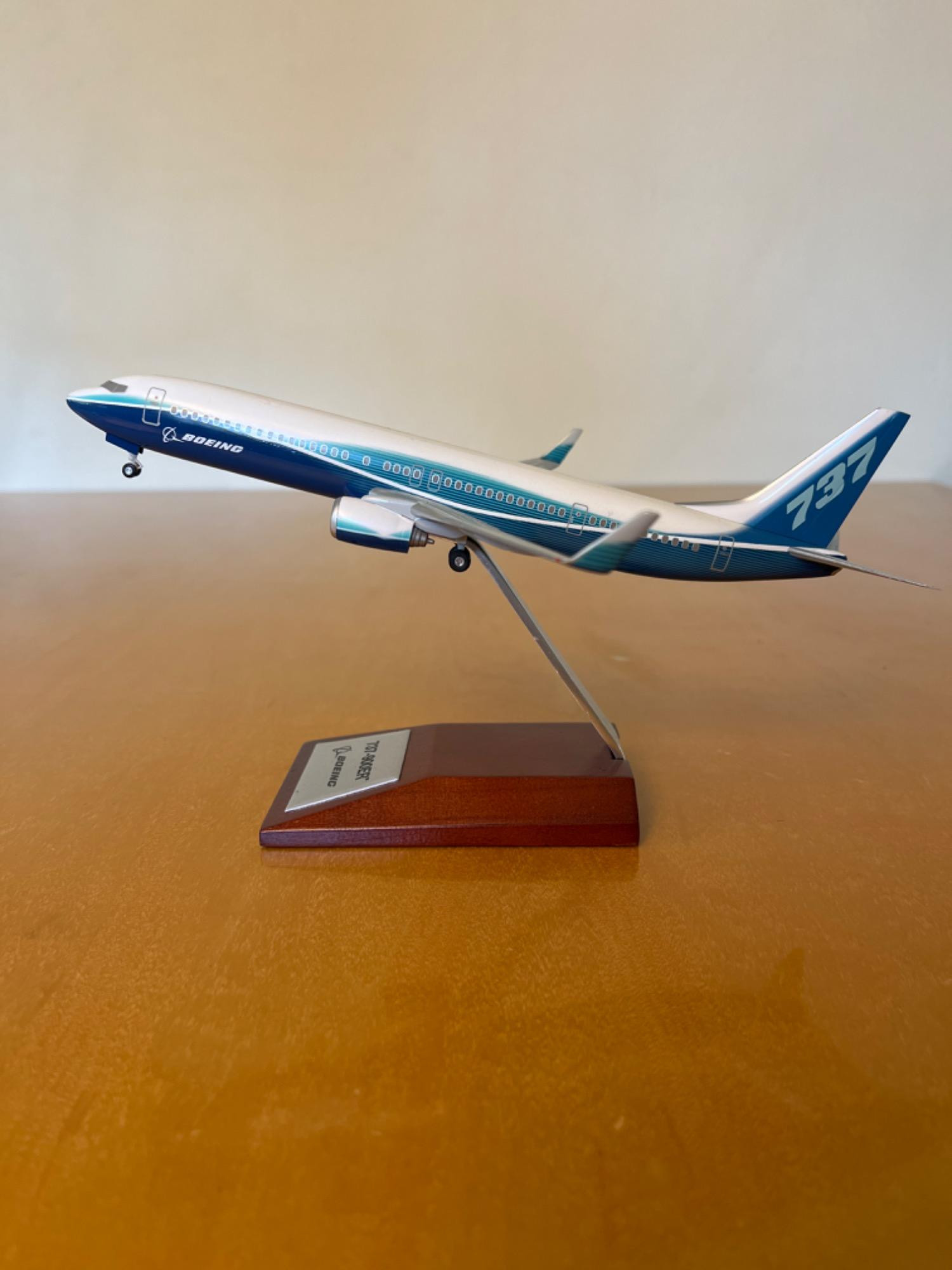 Boeing 737-900ER Model Airplane on Stand This plastic model is an exact replica of a Boeing 737-900ER. It has working wheels (they turn). Wooden stand w/metal holder Dimensions: 8 1/2”L x 7”W x 4 1/2”H