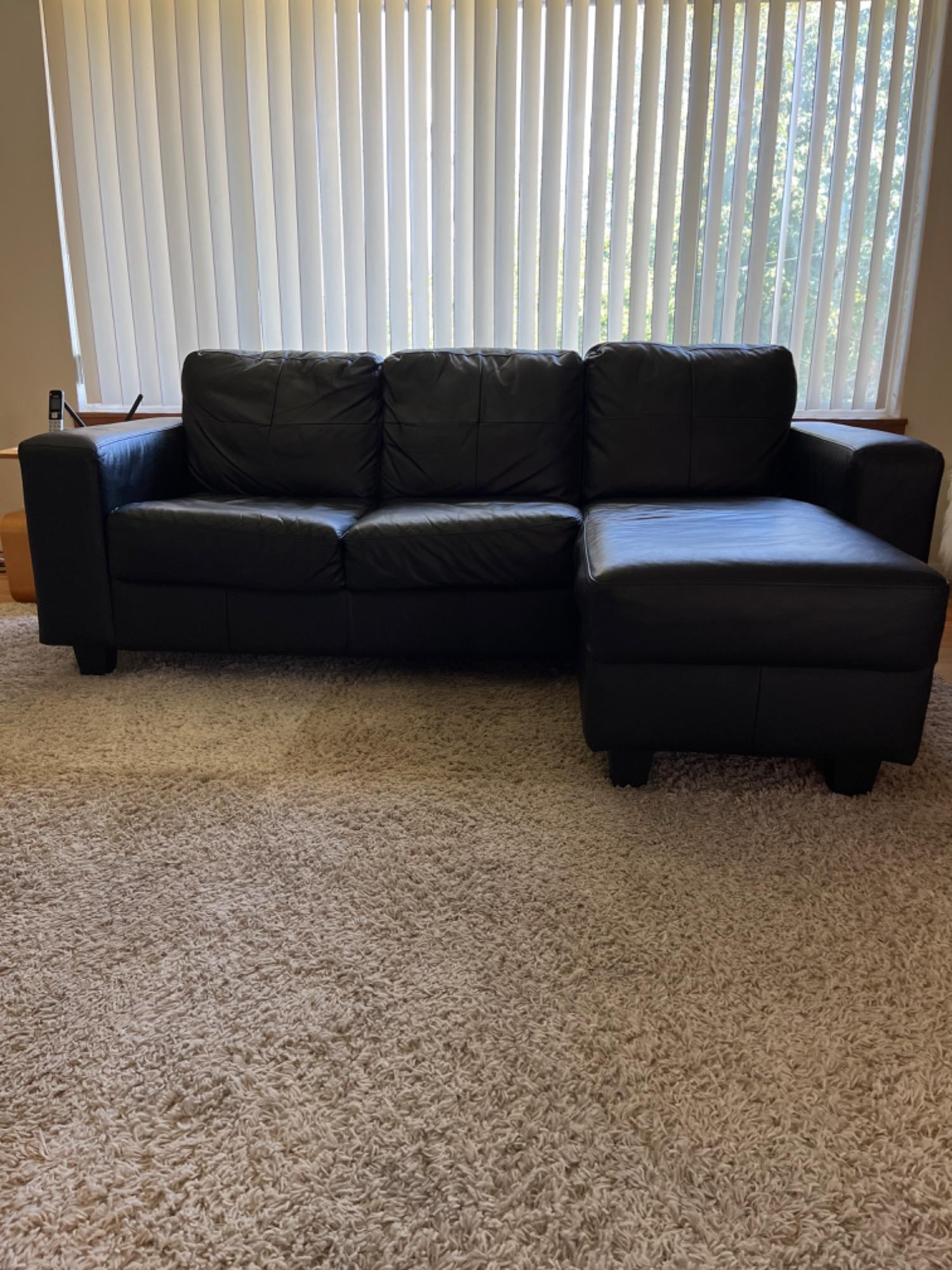 IKEA Black Faux Leather Couch with Chaise Smoke free home, pet free home It has no blemishes. The arms are in good condition...no wear 2 seats plus the chaise