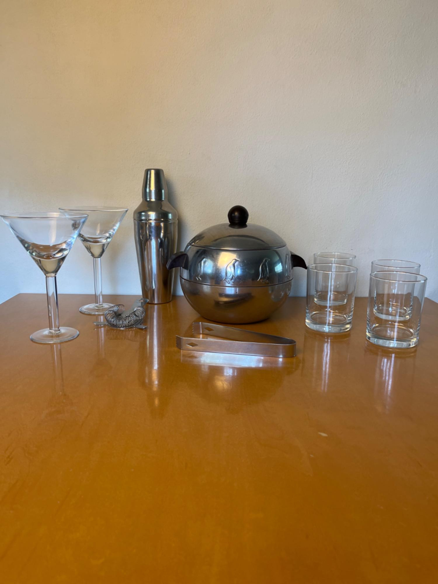 MCM West Bend Penguin Ice Bucket & Bar Ware Iconic 1960’s chrome West Bend ice bucket with tongs. Bakelite handles and knob add to the authenticity of the era. Chrome Shaker Dia.: 3 1/2” 10 1/2”H Martini glasses Dia.: 4 13/16 7 5/8”H Double Whisky glasses Dia: 3 1/4” 4”H