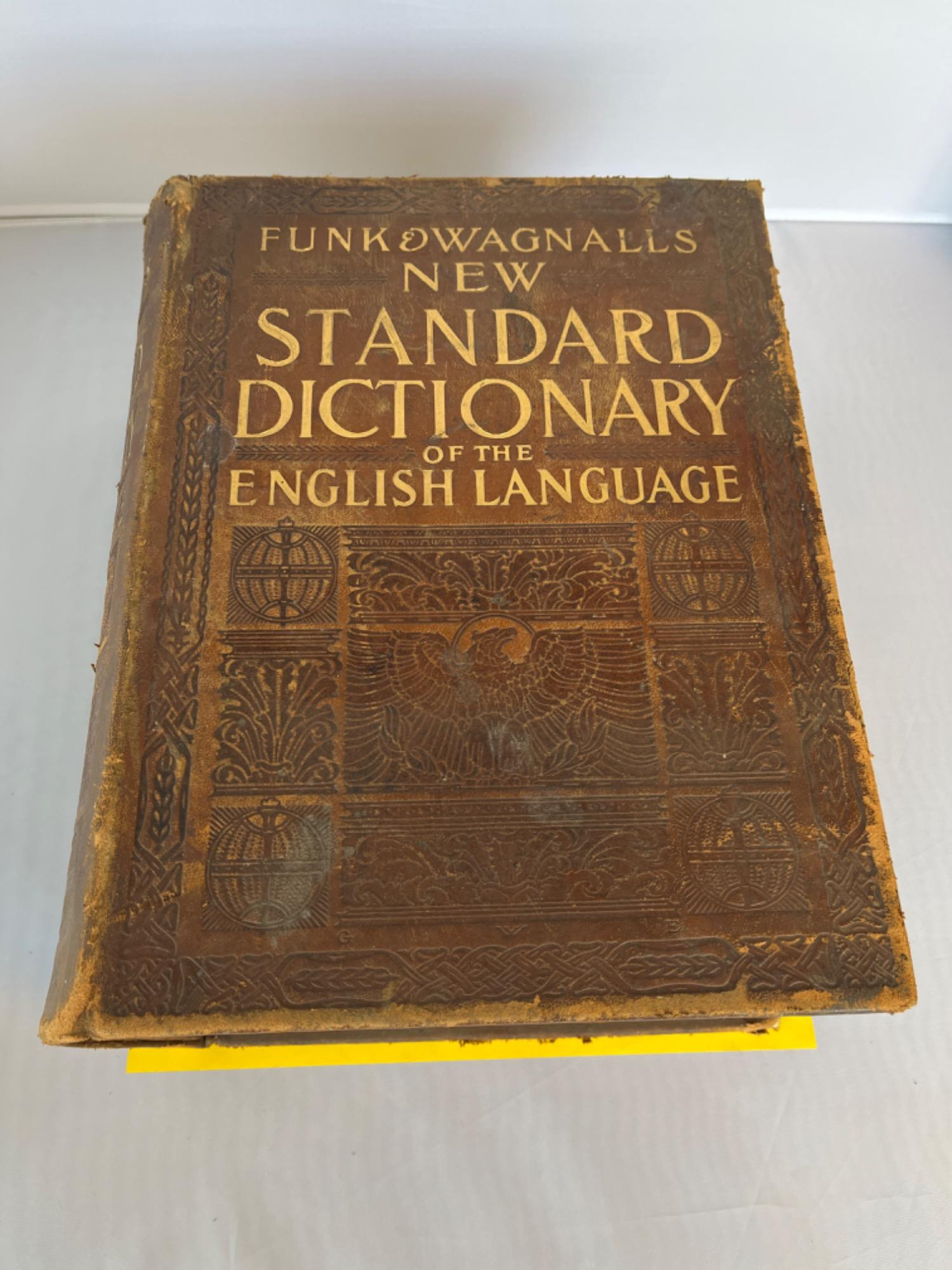 Funk & Wagnall’s Leather Bound Standard Dictionary of the English Language- 1913 This is a heavy book (weighing approx. 10 lbs) that is Complete in One Volume. Original deluxe decorative stamped and gilt full leather hard cover, with marbled edges and endpapers, and indent-tabbed/indexed fore-edge. Illustrated with drawings in-text, and with plates, some in color. The binding, pages and tabs are in good condition. The leather has wear...but it is from 1913. Wear can be expected from a book that is 111 years old. Please take note of all pictures in this listing. If you are a book enthusiast...this is one for your collection!
