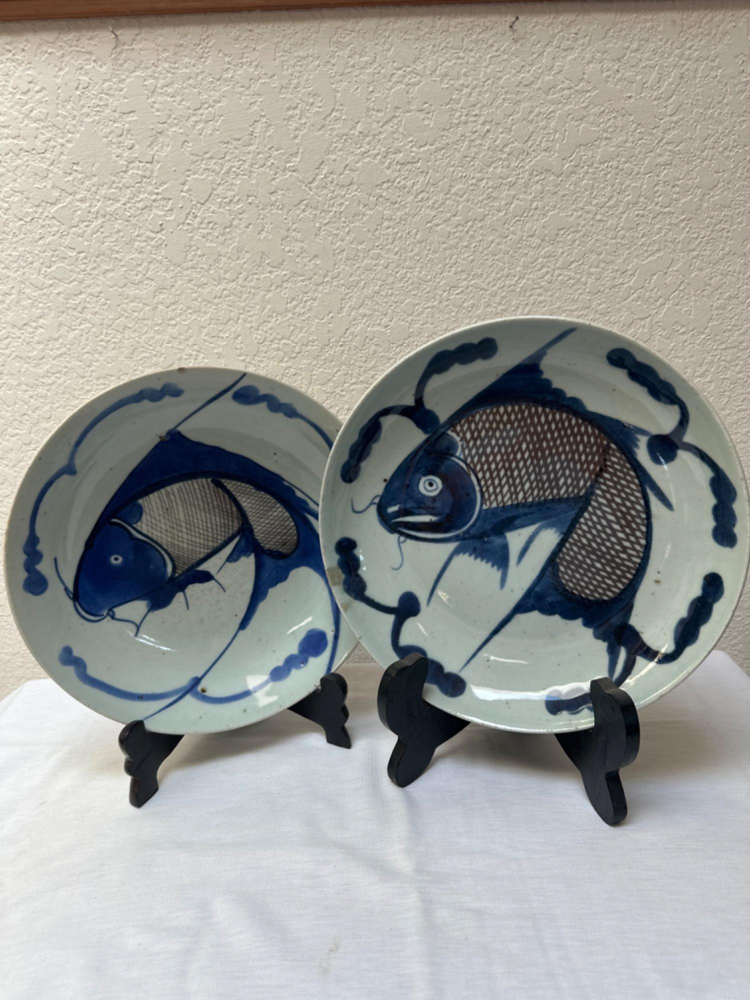 The “Imperial Waters: Qing Dynasty Blue and White Carp Porcelain Plates” are antique items made of porcelain. They feature a traditional blue and white color scheme with a carp fish motif, which is a common and culturally significant design in Chinese ceramics. Given their age, it’s not uncommon for such pieces to have some imperfections, such as slight discoloration, crazing, or minor chips. In Chinese mythology, the word fish is a homophone for “abundance” and “affluence”, making fish an emblem of wealth.