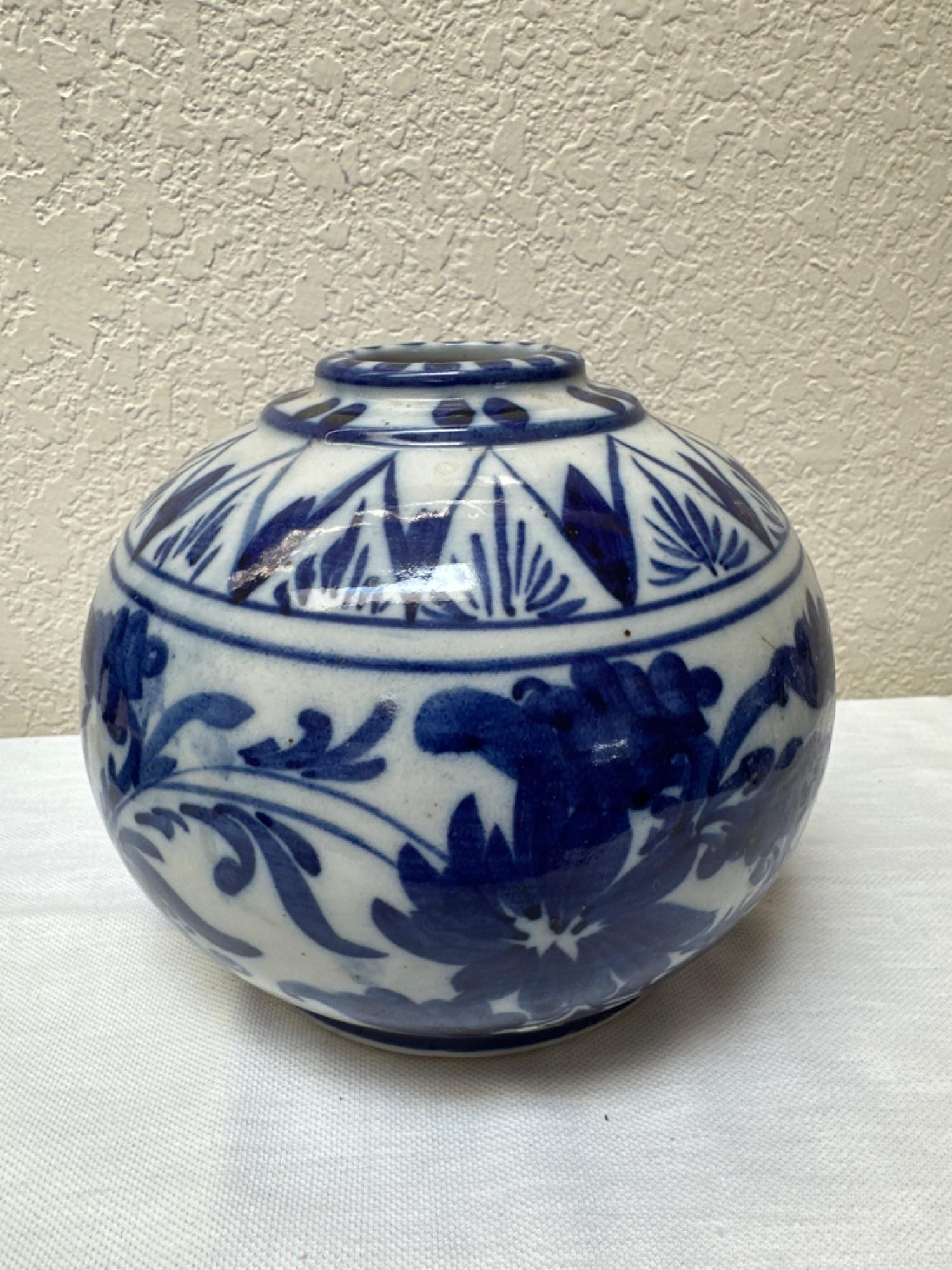 a spherical porcelain vase with small circular opening on top. Traditional