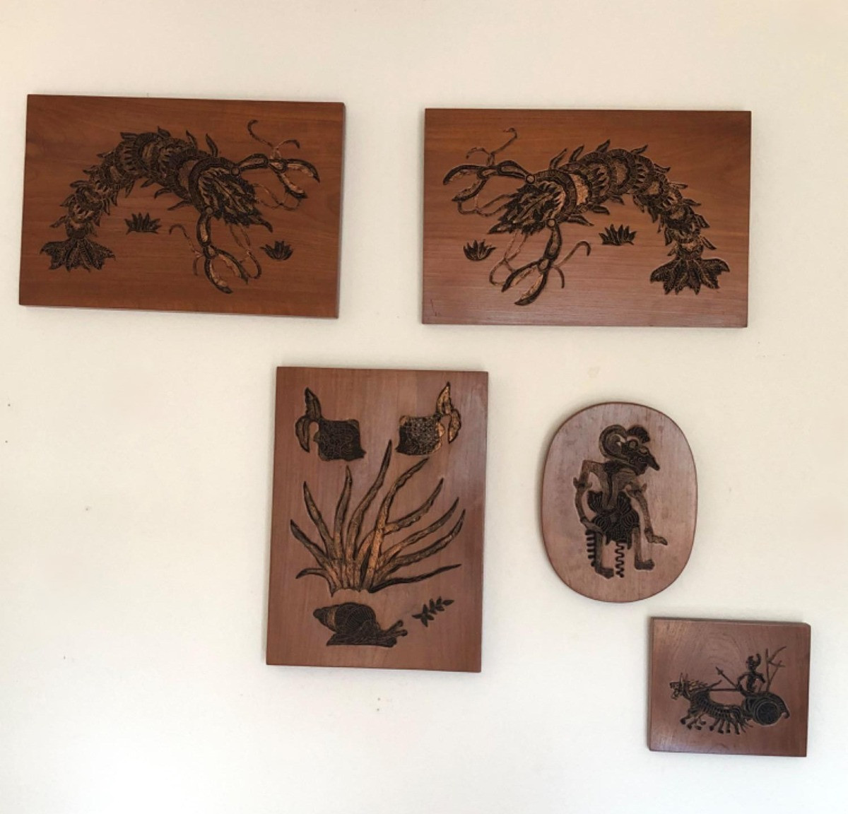 Set of five traditional Javanese Wayang Batik wooden stamps. Each stamp is intricately carved with metal designs inside the wood.