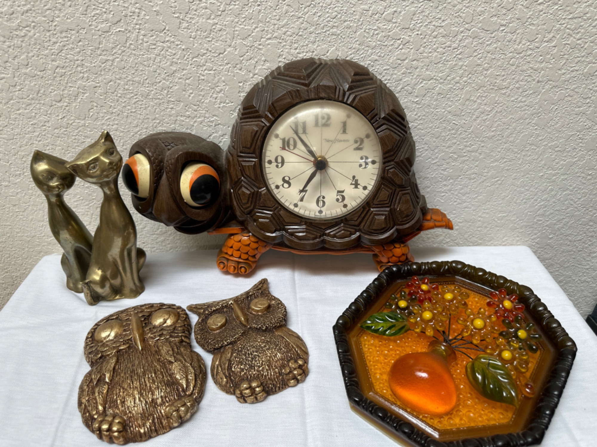 Turtle Wall Clock is likely made of a combination of plastic and plexiglass. Plexiglass needs cleaning; batteries not tested but overall appears to be in good condition. Manufactured by New Haven. Pair of Brass Cat Figurines with a mid-century aesthetic. Owl Wall Hangings is likely made of a combination of metal and possibly some other decorative materials with detailed feather textures. Ornamental Plate is likely ceramic or similar material with embossed fruit design in vibrant colors.
