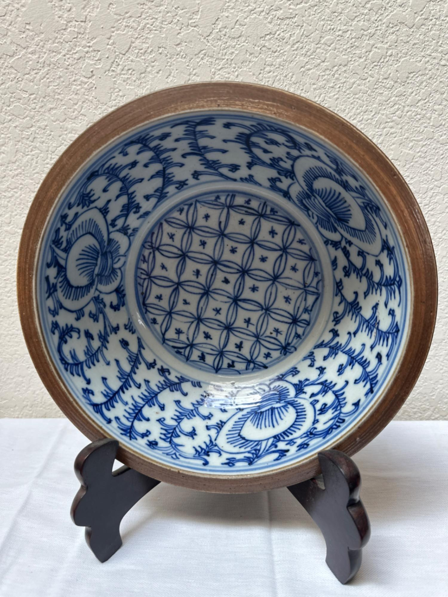 This antique Chinese Batavia bowl, crafted for export to Southeast Asia, dates back to the Late Qing period, circa 1890. The bowl features an intricate underglaze blue interior adorned with traditional Chinese motifs, such as floral patterns and possibly mythical creatures like phoenixes, arranged in concentric circles. The exterior is finished with a rich brown glaze, creating a striking contrast with the vivid blue and white interior. This combination of underglaze blue and brown glaze is characteristic of Chinese ceramics from this era, showcasing the exquisite craftsmanship and historical significance of the piece.