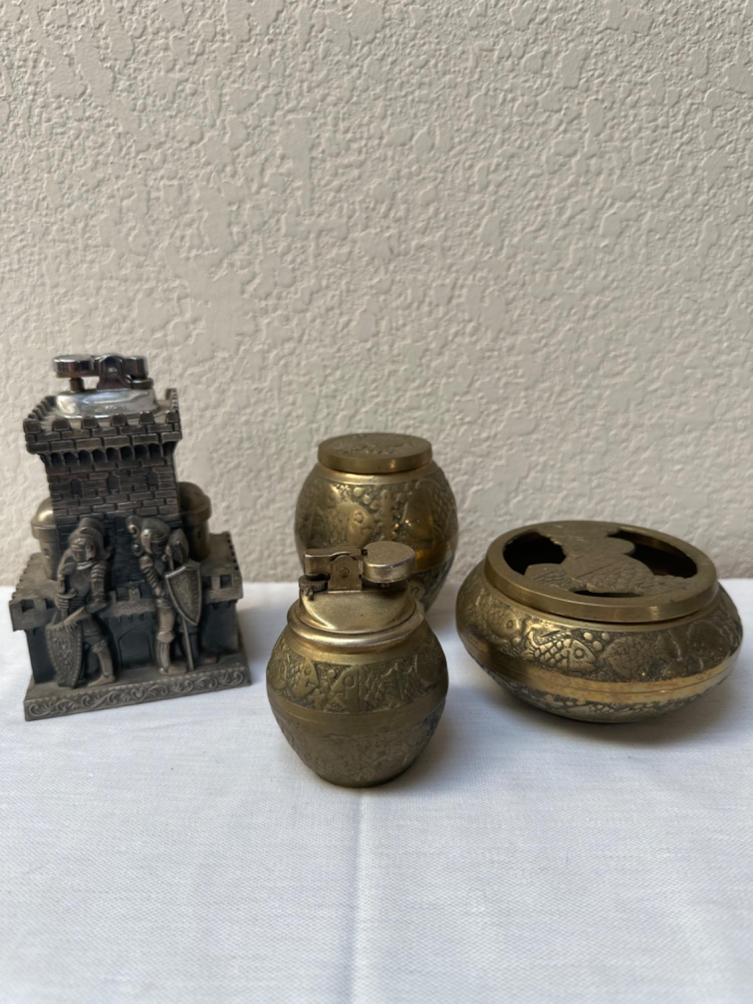 The image showcases a collection of intricately designed brass items. It features a detailed medieval castle design with turrets and battlements with a top lid lighter. The exterior is adorned with finely crafted knights in armor, standing guard around the structure. Two brass objects are stacked; one resembles a lighter with a lid, while another appears to be an ornate jar or container. Both pieces feature embossed designs, suggesting they are part of an ensemble. The set also features a fish motif, likely an ashtray or decorative plate, carved in an Asian style. A matching set, possibly vintage or collectible due to their craftsmanship and style.