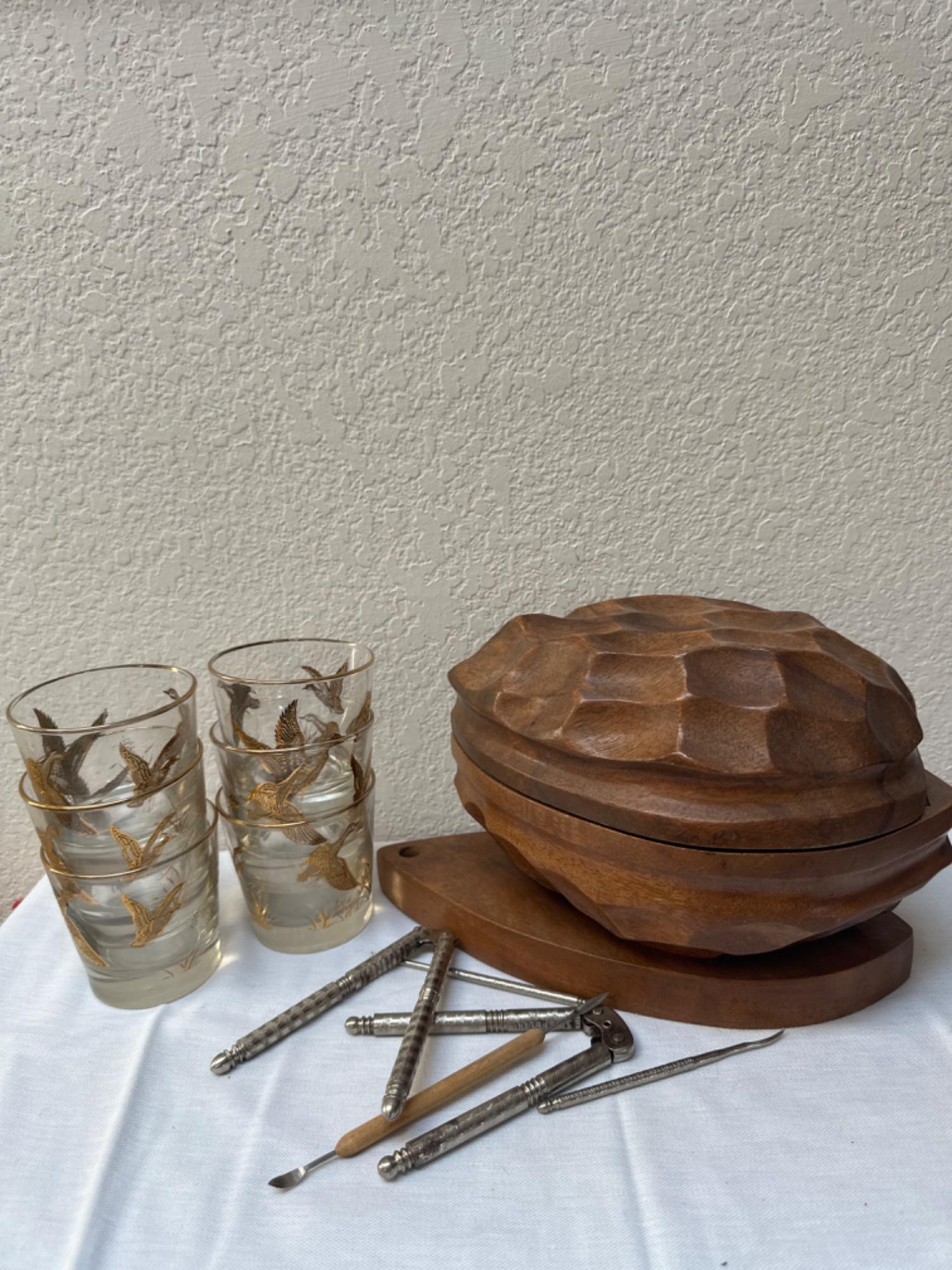 Nut bowl with hinged lid measures approximately 13 1/2 inches long by 7 1/2 inches tall Mid-century modern six tumblers.