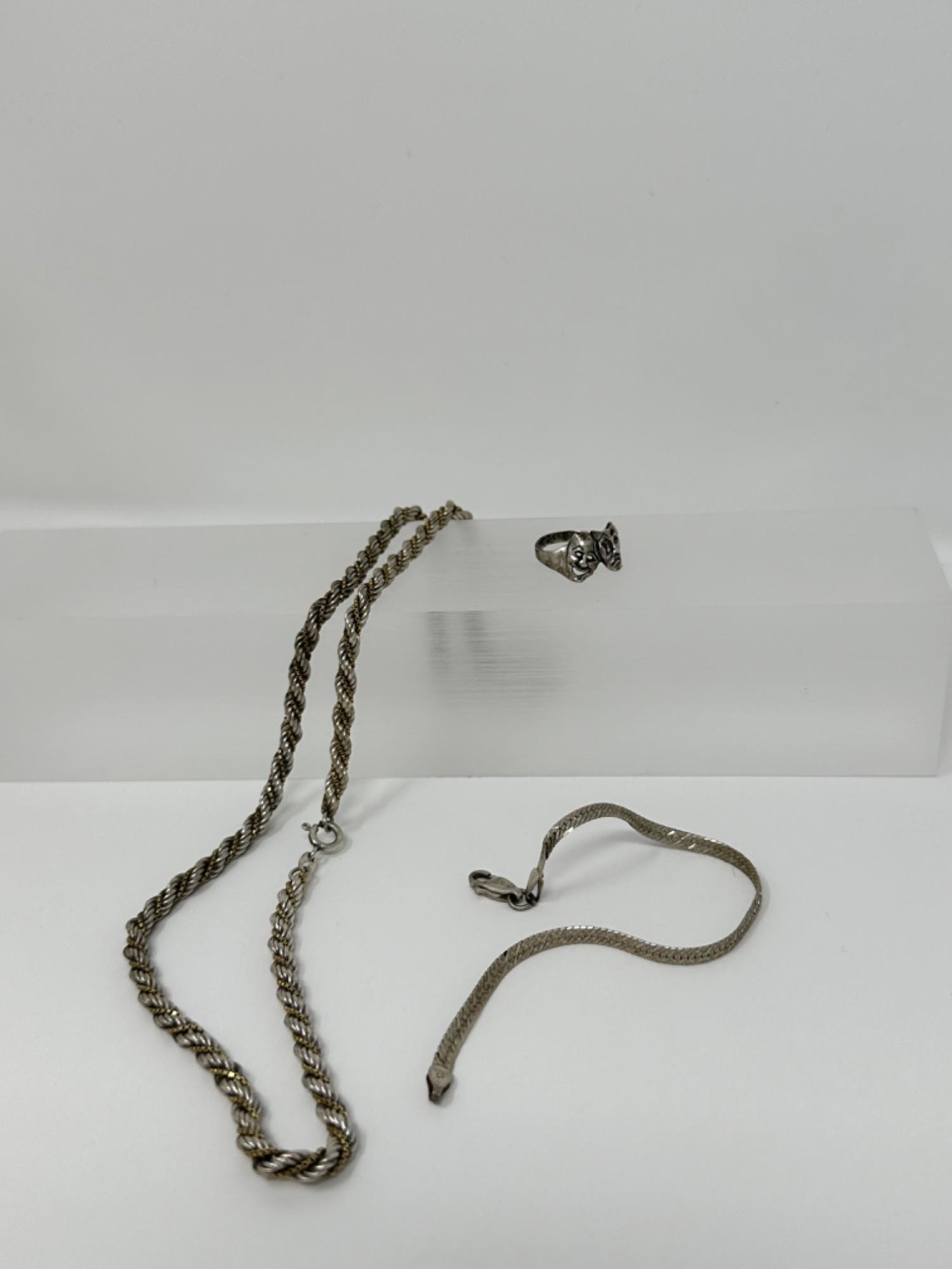 14" chain sterling necklace, bracelet and sterling drama ring. 2.5 grams.