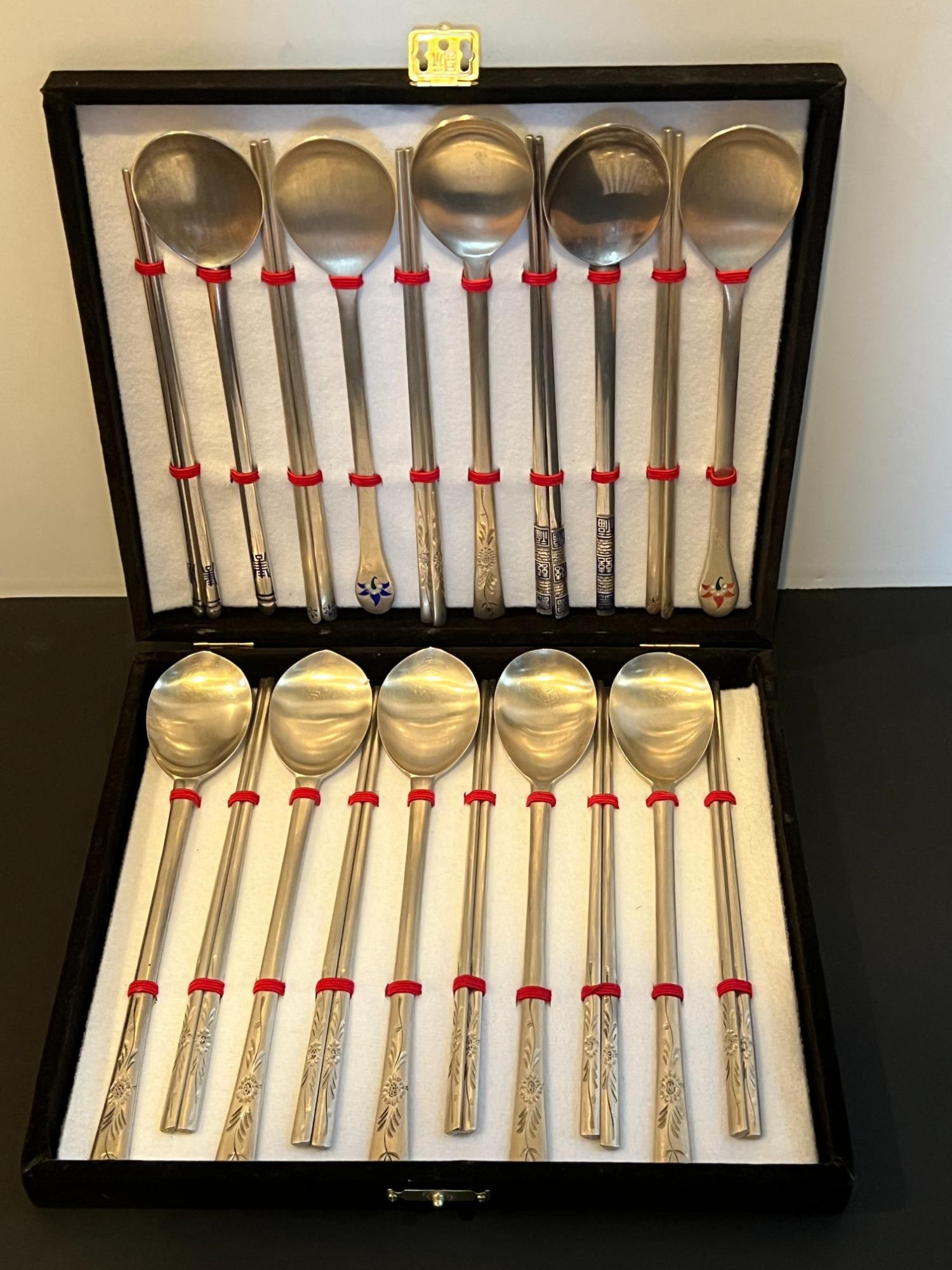 Korean 800 and 990 silver spoons and chopsticks in velvet clasped case. May or may not be a matching set. As found.