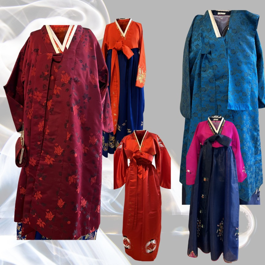 Maroon brocade coat with matching clasp purse. Small to medium size. Red and blue Hanbok dress under the coat. Wedding Duck design. Red satin Hanbok with Korean traditional wedding duck embroidery on satin. Size small to medium. Blue brocade coat with matching scarf. Small to medium size. Hot pink and navy Hanbok with traditional trim and silk chima. Includes one undergarment slip that creates the billowy affect for the skirt.