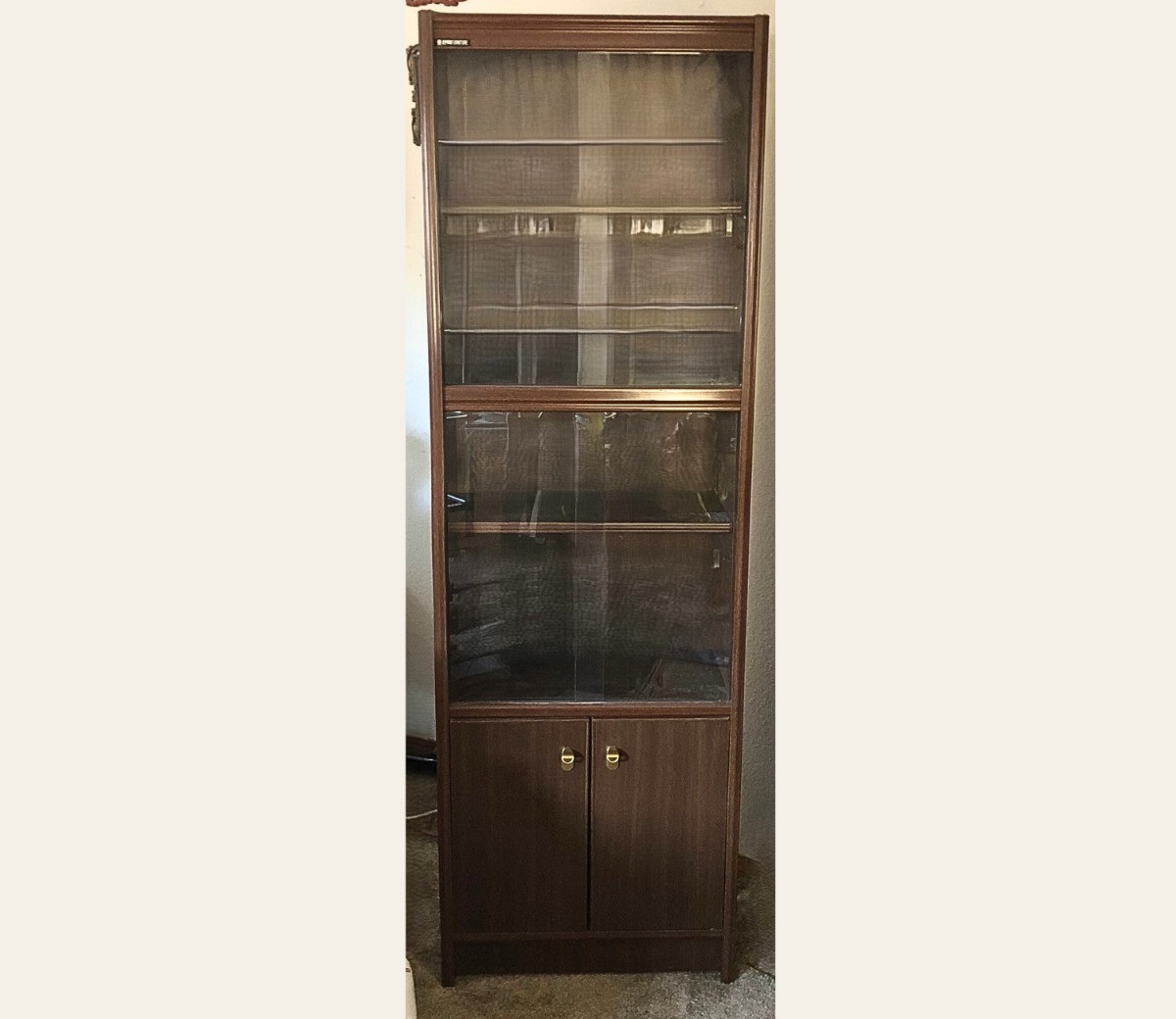 Korean Made veneer Bookcase with wood shelves and glass doors. Bidding on this lot is an agreement that: (1.) You
