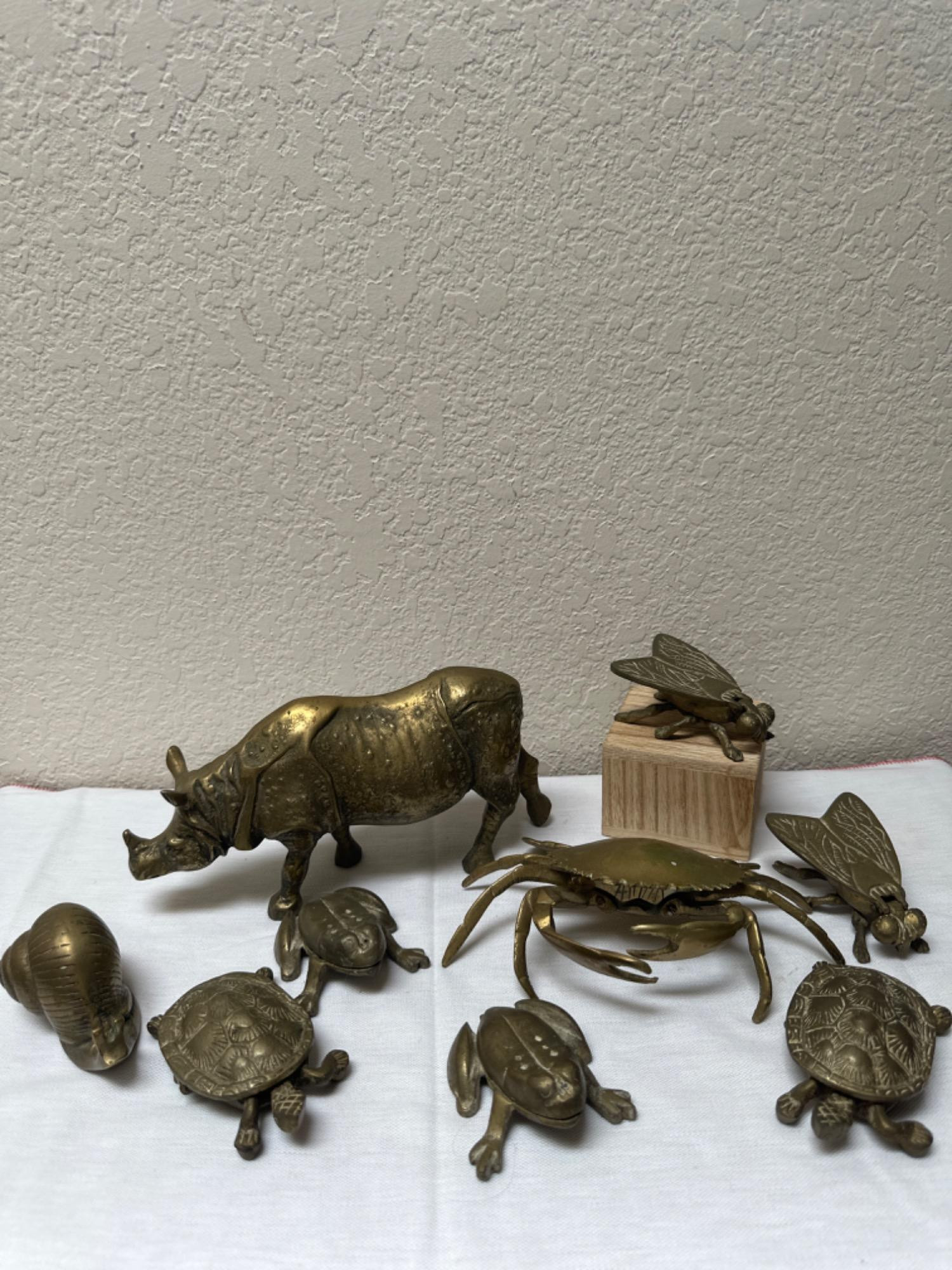 Vintage Solid Brass Rhino, Frogs, Turtles, Flies, Crab and Turtle. Rhino measures 9” x 4” tall frog measures 3 inches snail measures 3 1/2” x 2” each of the small animals have hinged lid with trinket box except for the snail.