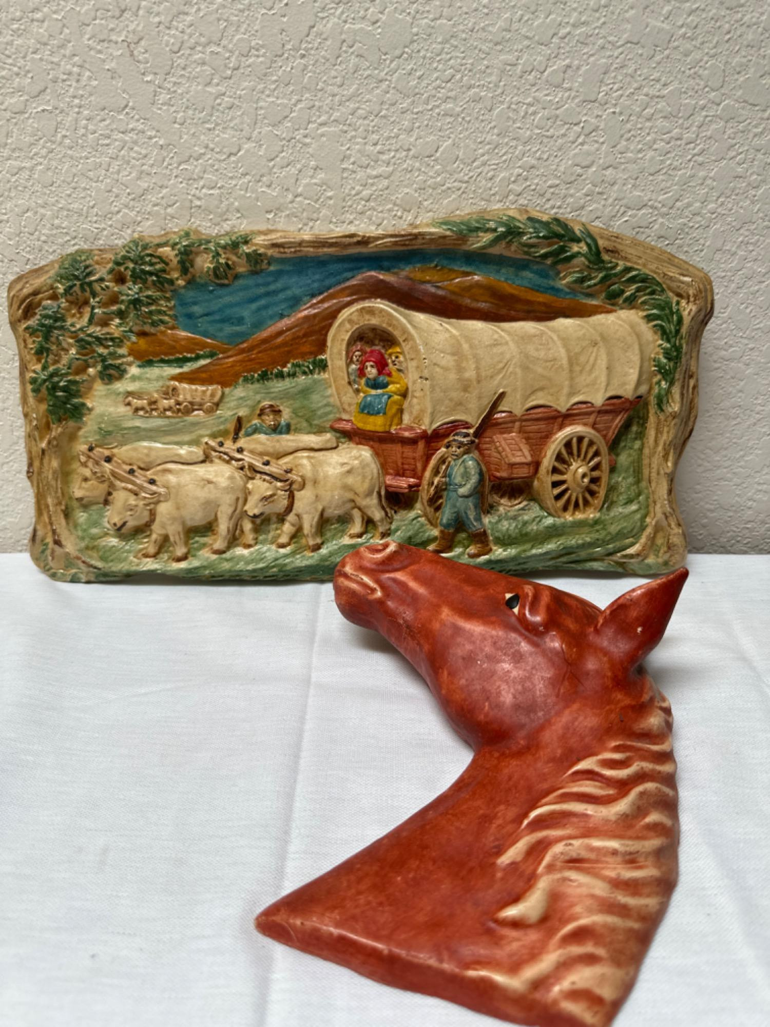 Chalkware Horse and Western Themed Plaque Wall Hangings. Plaque measures 15 x 7 1/2 shock horse measures 9 inches tall by 7 inches wide
