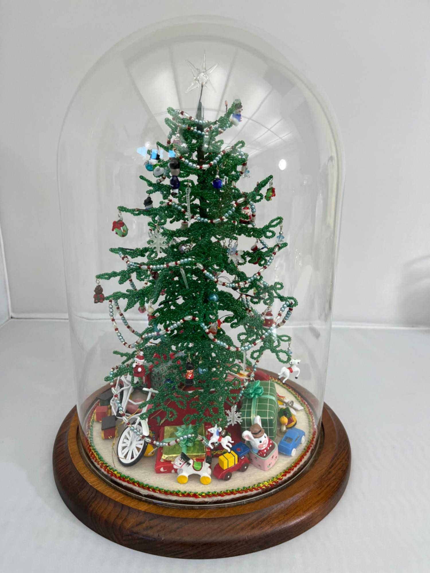 Hand Made Beaded Christmas Tree Under Glass w/ Hand Blown Glass Topper