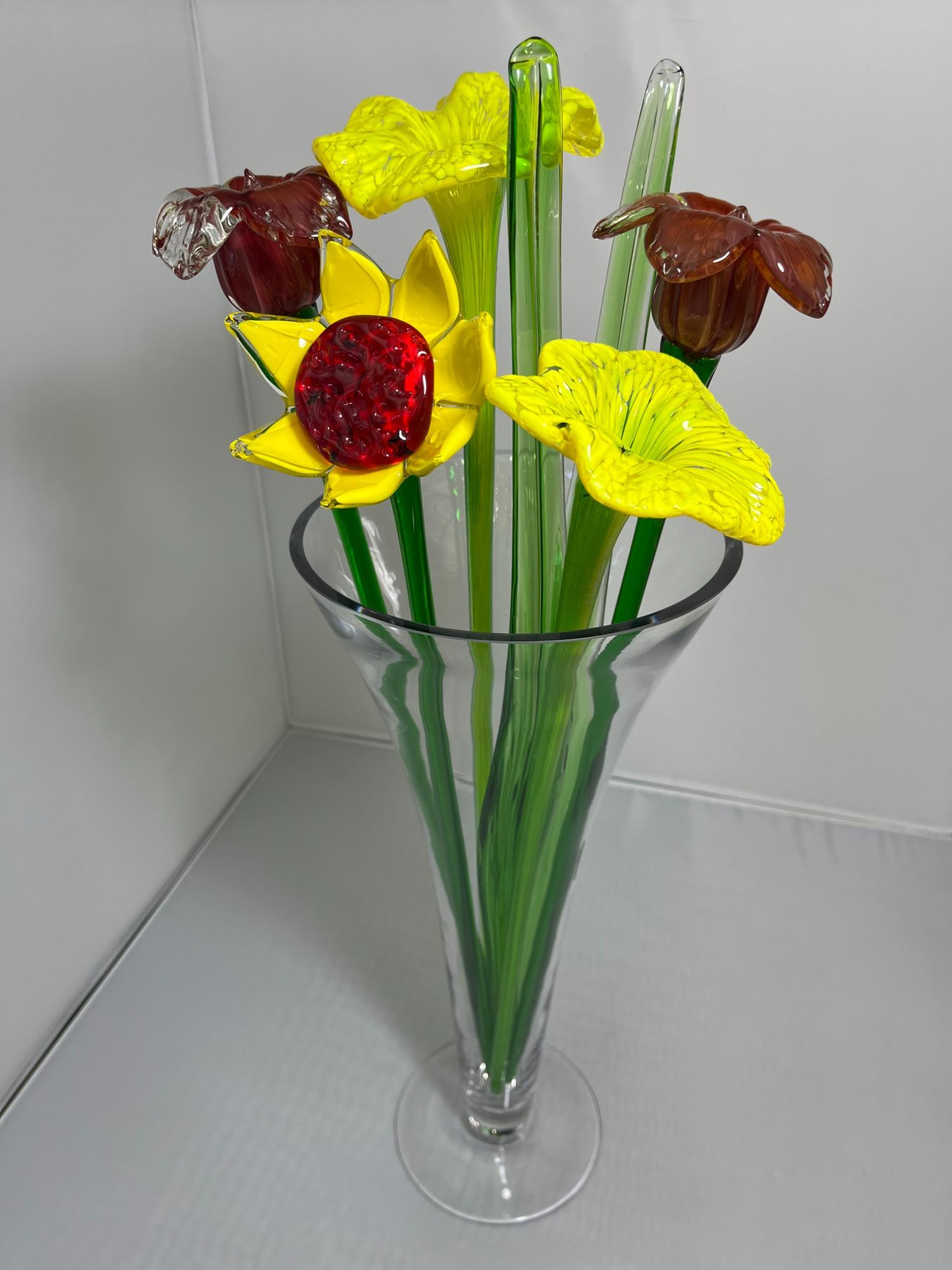 Lot # 50 - Vase of Hand Blown Glass Flowers & Leaves