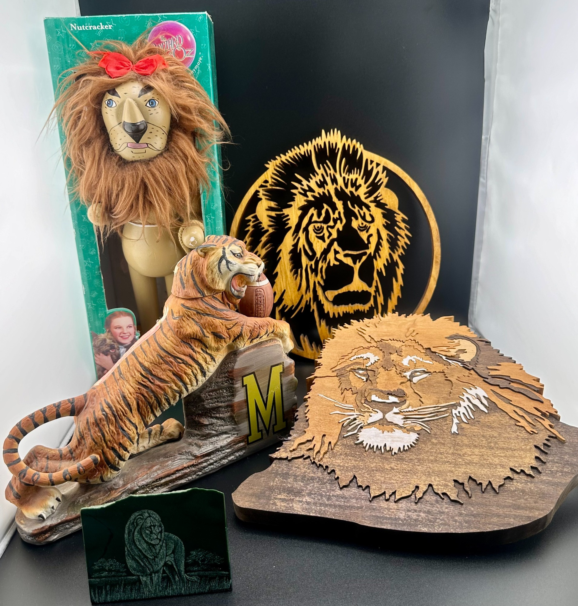 Wooden Lion with Porcelain Tiger Straight Bourbon Whiskey Decanter Wizard of Oz Nutcracker: 14 1/2" Straight Bourbon Whiskey Decanter: 10" x 8 1/2"