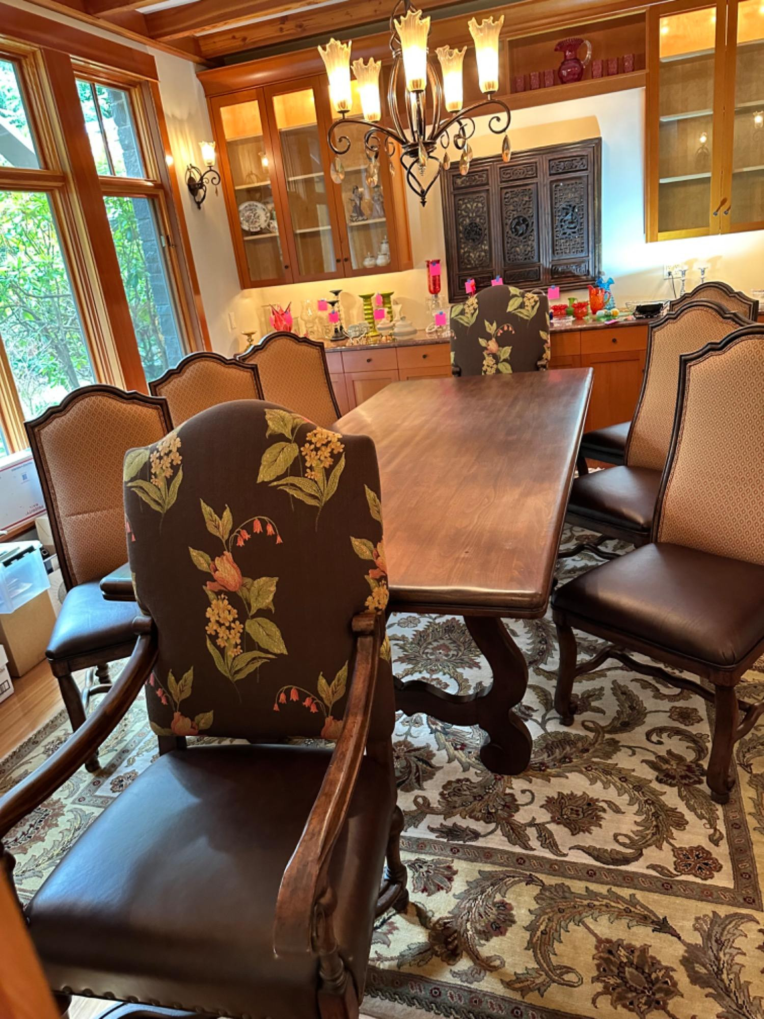 Drexel Rustic Continental Country Style W/Distressed Top and 8 Chairs. Dining table, rustic Continental country style with long distressed wood top, open curved end supports/legs and curved slender wrought iron stretchers. Appears to be the "Long Tavola For A Feast" from Drexel Heritage's "Frances Mayes' At Home In Tuscany collection. Armchairs, master dining chairs, arched back, open arms with turned supports and legs, shaped stretchers, brown floral tapestry back and leather seats. Appears to be "Palazzo Armchair" from Drexel Heritage's "Frances Mayes at Home In Tuscany" collection. Top is one solid piece. Some wear but very good condition. Chairs measure- 48.5 h x 23 w x 29 d.