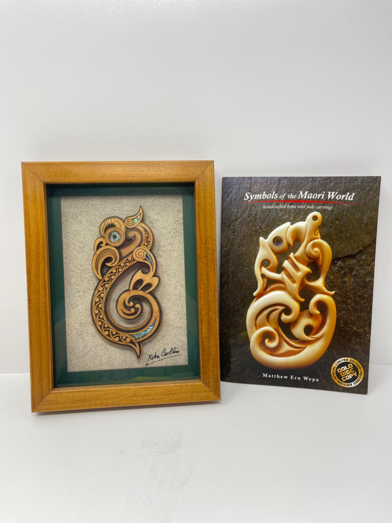 Woodcarvnig by Aboriginal Artist Mike Carlton. Ethnographic handcarved interpretation of Te Manaia or Guardian Spirit In Maori spiritual tradition. Intricate traditional serpentine design, abalone accents. Rotorua, New Zealand. Mounted in a wooden shadowbox frame. Detailed explanatory note on the reverse. 6.75 x 8.75 “