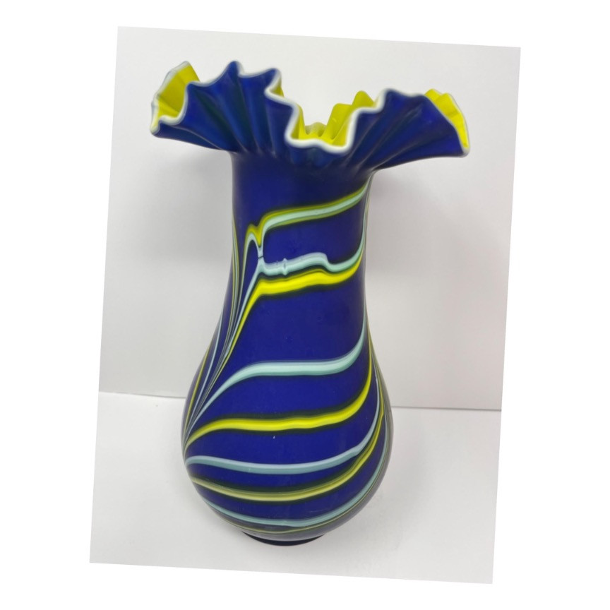 This vibrant hand-blown glass vase features a flared top with ruffled edges, adding a touch of elegance to its design. The main body of the vase is a deep blue color, adorned with swirling lines of yellow and lighter blue that create a striking contrast and dynamic pattern. These lines accentuate the curves of the vase, giving it a sense of movement and fluidity. The vase is made from glass, a material known for its versatility and ability to be shaped into intricate forms while in a molten state. Once cooled, the glass hardens into a durable and beautiful object. Hand-blown glass items are unique due to the individual crafting process, where artisans blow air into molten glass to form various shapes. Please note that there are some small scratches and stains visible on the surface, as shown in the photos. Measurement: 12” inches tall