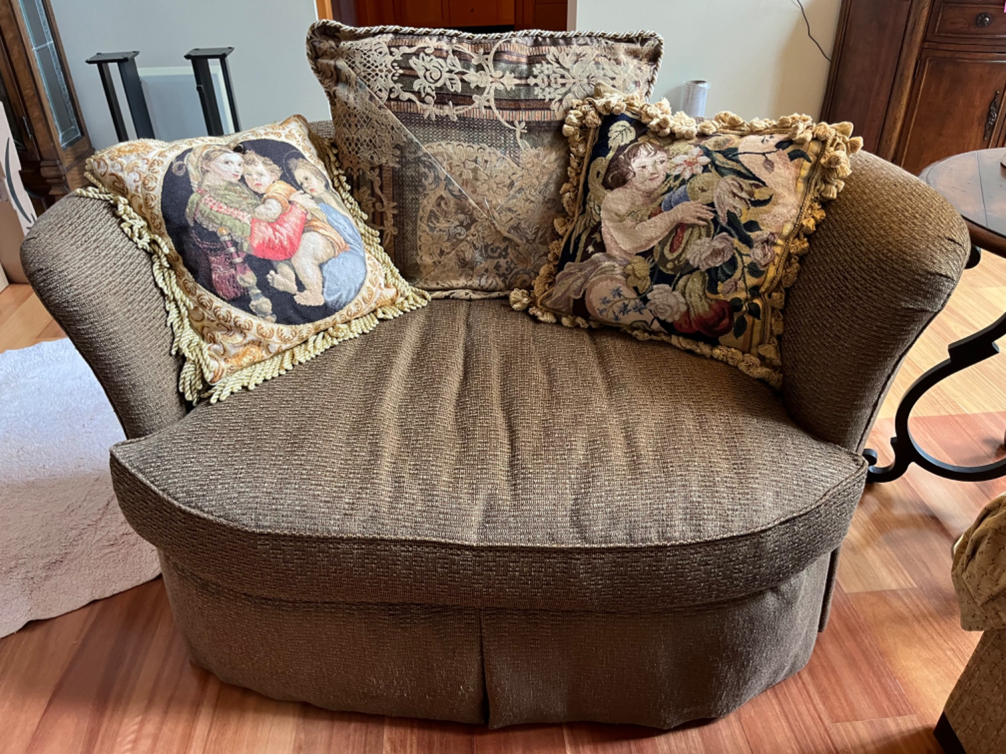 The Elegant Ferguson Copeland Oversized Armchair with Ornate Pillows is a luxurious piece of furniture that exudes opulence and classical charm. The chair features a wide, plush seat cushion and a substantial, rounded backrest, both upholstered in a textured brown fabric that appears to be a durable woven material. The armchair is complemented by two decorative pillows, each adorned with intricate tapestry-like designs. One pillow depicts a classical painting of a mother and two children in period attire, while the other showcases an individual in historical dress, adding a touch of elegance and historical flair to the overall aesthetic. Ferguson Copeland is a high-end furniture manufacturer based in North Carolina, USA, known for drawing inspiration from various historical furniture styles.