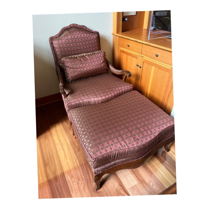 The Custom Handcrafted Drexel Heritage Upholstered Chair and Ottoman Set is a stunning example of fine furniture craftsmanship. The chair features a high backrest adorned with elegant button detailing, providing both comfort and a touch of sophistication. The matching ottoman complements the chair perfectly, offering a cohesive look. Both pieces are upholstered in a luxurious fabric that showcases intricate patterns, adding to their visual appeal. The wooden legs of the chair and ottoman are meticulously carved, highlighting the artisan quality of the set. The wood used is likely a high-quality hardwood, known for its durability and rich finish. This set not only serves as a functional seating arrangement but also as a statement piece, reflecting the timeless elegance and superior craftsmanship associated with the Drexel Heritage brand. Drexel Heritage is known for using a variety of rich textiles, such as velvet, brocade, or damask, which are not only visually appealing but also provide a plush and comfortable seating experience. Measurement: Chair - 41 h x 34 w x 29 d Ottoman 17h x 34 w x 26 d