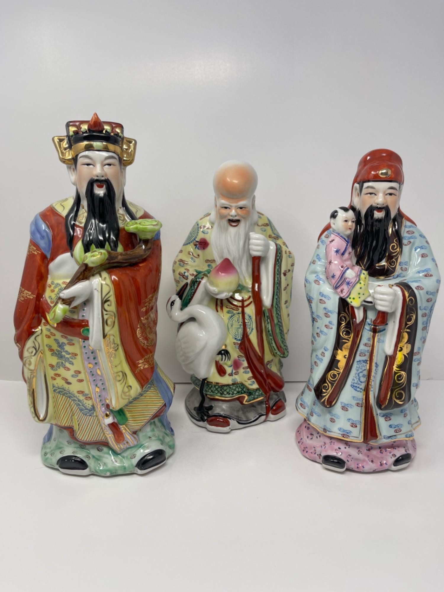 The item of a trio of antique hand-painted Chinese porcelain figurines, is often referred to as Immortals. These figurines are crafted from high-quality porcelain, known for its durability and glossy finish. Each figure is meticulously hand-painted with vibrant colors and intricate patterns, showcasing traditional Chinese attire and symbolic objects. The central figure holds a staff and has a long white beard, suggesting wisdom or age. The left figure carries a mossy wooden stick, while the right figure holds what appears to be beads or a rosary, possibly a broken sword handle. Notably, the far-right figure has a broken piece, which is visible in the photos. Measurement: Shortest: 11.5 inches tall Tallest: 13 inches tall