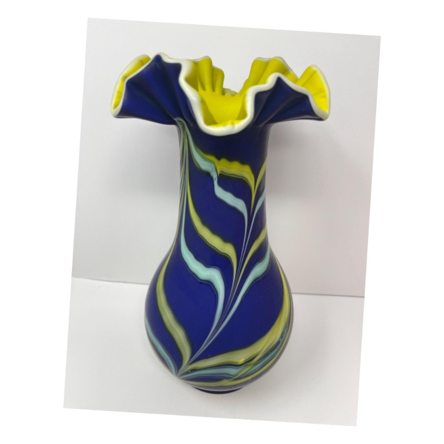 The Oceanic Blue and Sunburst Yellow Vase is a striking piece of art glass, characterized by its vibrant color palette and fluid design. The vase features a flared opening, with the exterior predominantly showcasing a deep oceanic blue hue. The rim and interior are adorned with a bright sunburst yellow, creating a captivating contrast. Swirling patterns of blue, yellow, and hints of green flow seamlessly across the body of the vase, evoking images of flowing water or undulating plant life. The glossy finish of the vase suggests it is made of high-quality glass, reflecting light beautifully and enhancing its visual appeal. There are some minor staining marks on its surface, suggesting use or exposure over time. Measurements: 12 inches tall