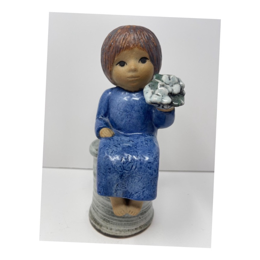 The Rare Lisa Larson Gustavsberg ‘Flower Girl’ Ceramic Figurine is a charming piece crafted from high-quality ceramic. This figurine depicts a young girl sitting upright on a round base, dressed in a textured blue dress that features subtle variations in hue, giving it a realistic fabric-like appearance. The girl holds a bouquet of flowers in one hand, with the flowers depicted in various shades of green and white, adding a touch of natural beauty to the piece. Her hair is styled in brown tones with visible strands, enhancing the lifelike quality of the figurine. The shoes are painted in an earthy brown color, providing a nice contrast to the predominantly blue attire. Lisa Larson, a renowned Swedish ceramic designer, created this piece for Gustavsberg, a well-known Swedish pottery company. Larson began working with Gustavsberg in 1954 and quickly became famous for her unique and expressive ceramic creations. Her works are often characterized by their whimsical and heartwarming style, making them highly collectible. The ‘Flower Girl’ figurine is a perfect example of Larson’s ability to infuse charm and personality into her designs, making it a treasured item for collectors of fine ceramics and Scandinavian design. Measurement: 8.5 inches tall