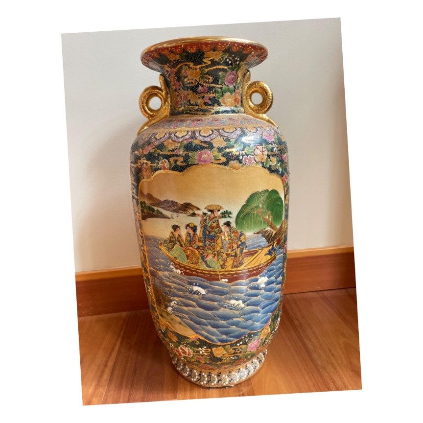 Satsuma Porcelain Vase is a stunning example of traditional Japanese craftsmanship. This 24-inch floor vase is made from high-quality porcelain, known for its durability and fine texture. The vase features intricate gilded detailing and vibrant scenic imagery, depicting figures in traditional attire amidst a picturesque landscape of mountains, water, and foliage. The use of gold accents enhances the overall elegance and adds a touch of opulence to the piece. Satsuma pottery, including this vase, has its roots in the late 16th to early 17th century when Korean potters were brought to Japan. The Satsuma region, located in southern Kyushu, became a prominent center for pottery production due to its abundant local clay and proximity to the Korean peninsula. The distinctive style of Satsuma ware, characterized by its warm cream, ivory-to-beige background with a cracked glaze and over-glazed designs in vibrant colors, became highly sought after, especially during the Meiji period (1868-1912). Chinese made Japanese ware. Please note that there are some minor stains and scratch marks on its surface, suggesting use or exposure over time. (Shown in photos.) Measurement: 24 inches tall