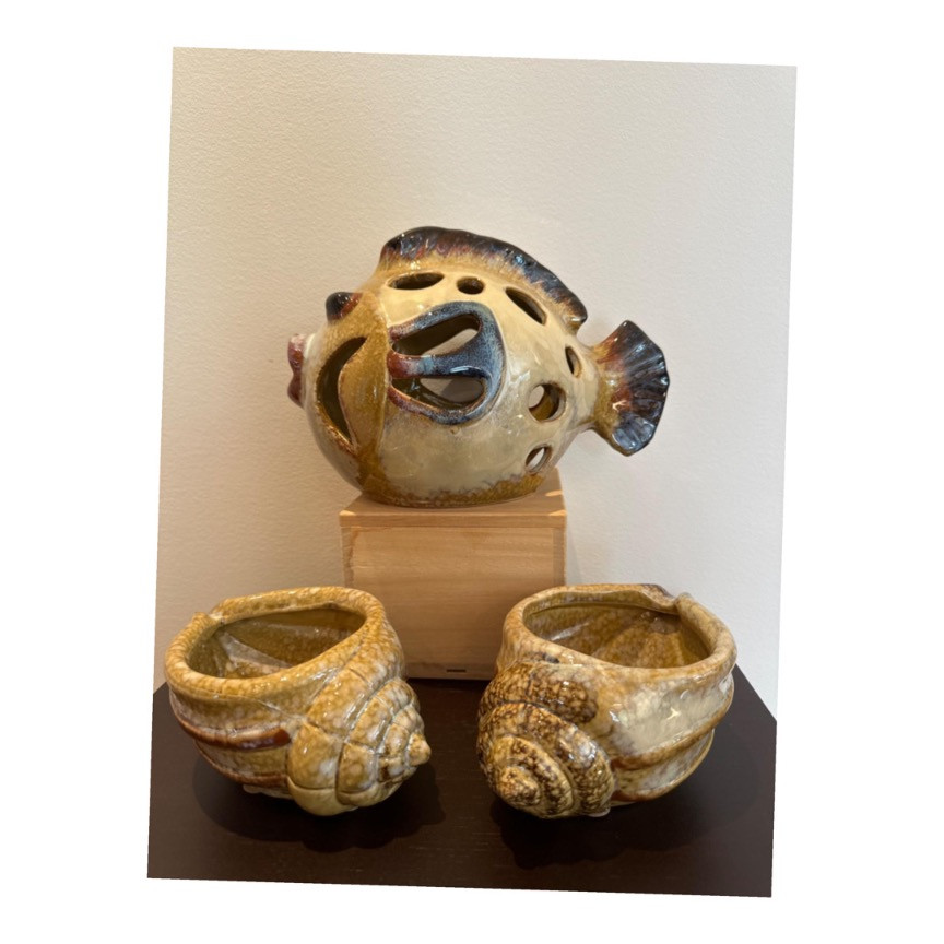 The Aquatic Inspiration Ceramic Set features a beautifully crafted pufferfish vase and two seashell bowls, all made from glazed ceramic. The pufferfish vase is the centerpiece, designed to replicate the rounded body and spiky texture of a pufferfish. It showcases a gradient color scheme, transitioning from sandy beige at the base to darker hues at the top, enhancing its naturalistic appearance. The vase is adorned with an array of holes that mimic the fish’s pattern, adding to its intricate design. Measurement: 11 x 7.5 7 x 3 shells