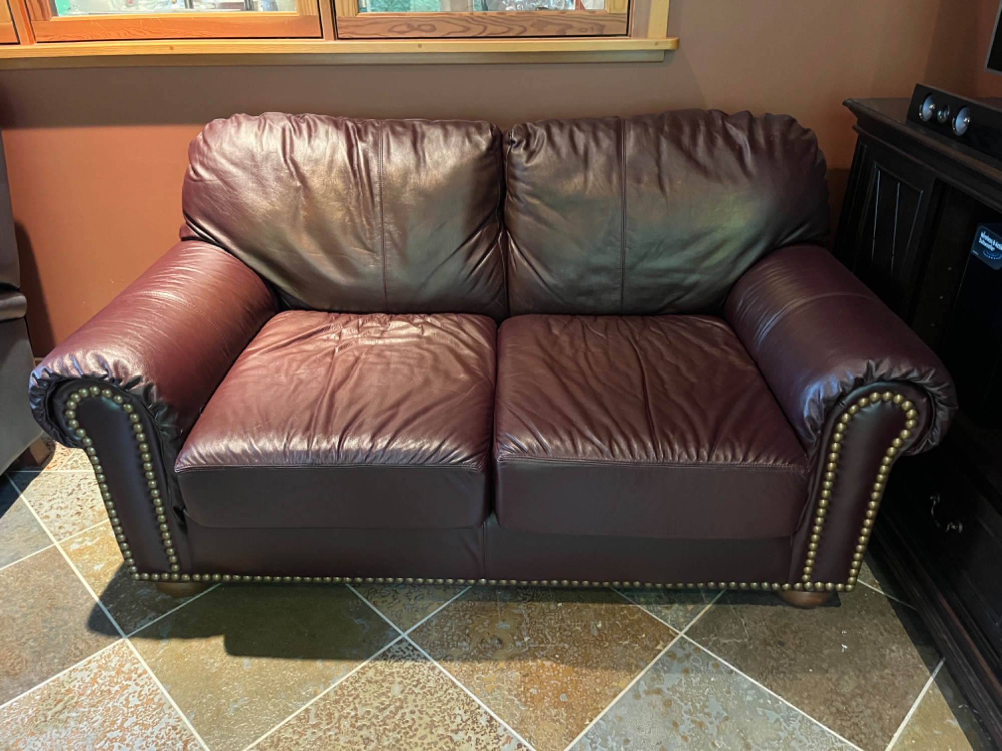 The Thomasville Luxurious Leather Loveseat is a beautifully crafted piece of furniture, upholstered in rich, dark brown leather. This loveseat features a classic design with rolled armrests, which add to its traditional and elegant aesthetic. The front of the armrests and the lower front border are adorned with nailhead trim, providing a sophisticated and decorative touch. The cushions are plush and well-padded, ensuring comfort for anyone who sits on it. The backrest is divided into two large cushion sections, which are slightly tufted, showcasing the craftsmanship involved in its construction. The loveseat is made primarily of high-quality leather, known for its durability and ability to age gracefully, often developing a unique patina over time. The frame is likely constructed from sturdy wood, providing a solid foundation for the piece. Thomasville is a reputable brand with a long history of producing quality furniture since 1904. The brand is known for its commitment to craftsmanship and timeless designs.