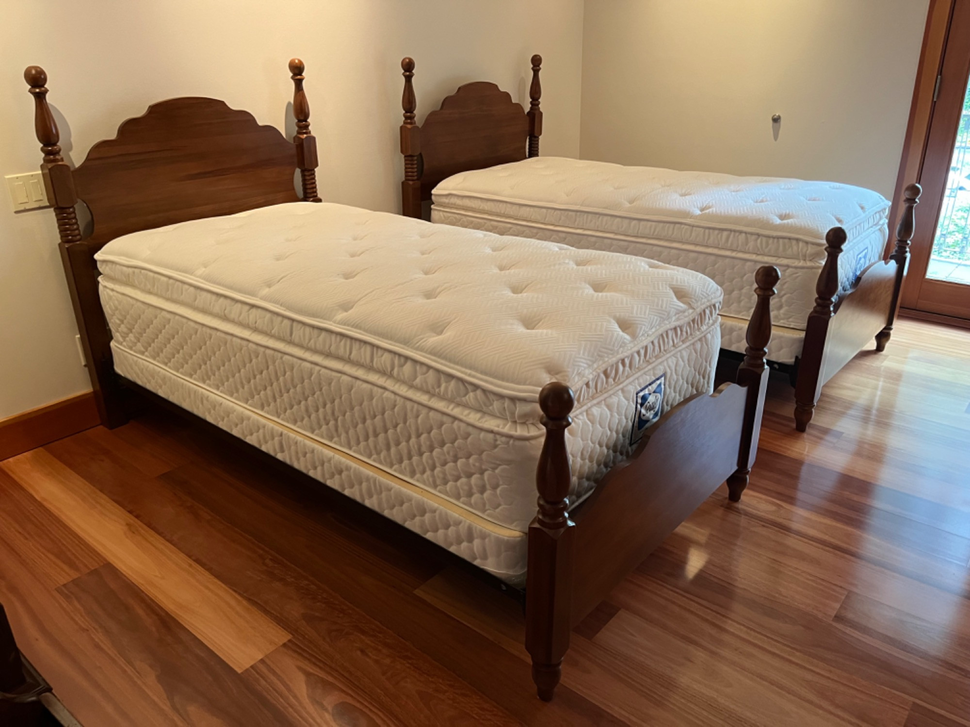 Two Mahogany Four Poster Twin Beds Including Plush Sealy Mattresses. The bed frames are made of solid mahogany wood, showcasing traditional design elements such as turned posts and carved headboards. These features suggest a high level of craftsmanship and durability. The wood has a rich, dark finish, adding to the aesthetic appeal and giving the frames a timeless, elegant look. The pair of Sealy twin mattresses, each resting on a classic solid wood bed frame. The mattresses are plush and feature a quilted top, likely filled with high-quality foam or fiber materials to provide comfort and support. They are encased in a durable fabric, which may be a blend of cotton and synthetic fibers, ensuring longevity and a soft touch. Today, Sealy is known as America’s #1 mattress brand, with a reputation for quality, innovation, and comfort that spans over 140 years. Clean and hardly used. Measurement: Frames are 49 h x 41.5 w