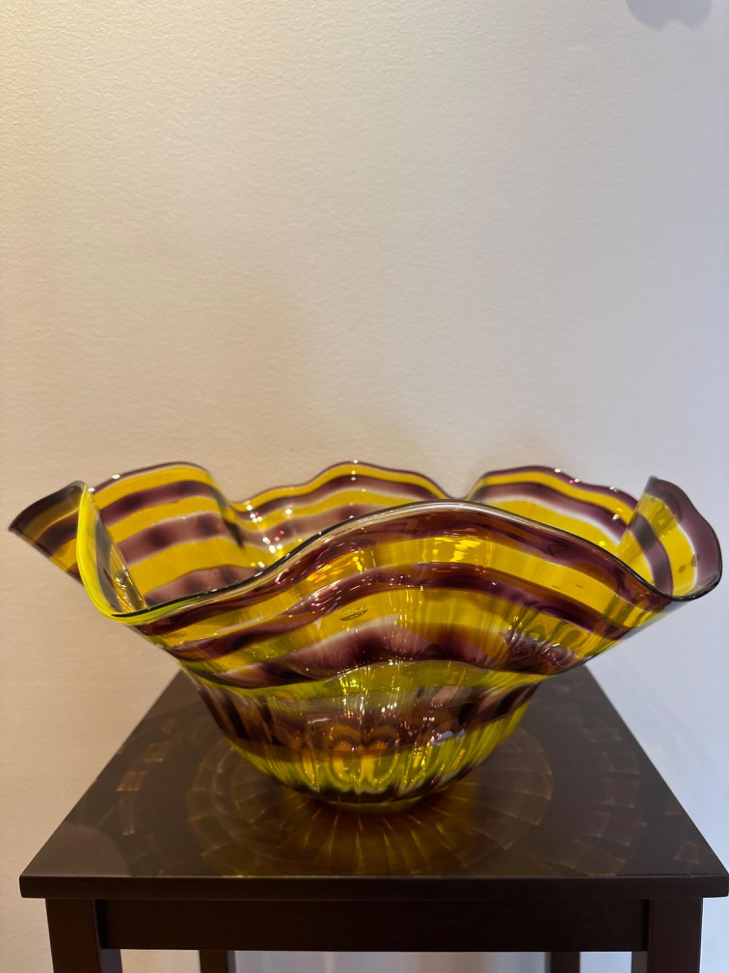 Art glass bowl with a large handblown form with a fluted body and rim. Wavy pattern with purple and gold stripes with slightly asymmetrical from. No signature found, but typical of Hilltop Artists' work. 8 T x 18 diameter