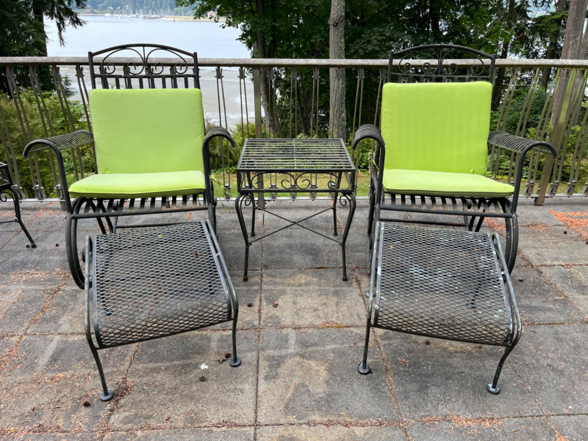 The Metal Patio Rockers, Ottomans, and Table set features a cohesive design with a mesh pattern. The rockers and ottomans are constructed from metal, likely steel or aluminum, ensuring durability and suitability for outdoor use. Each piece is complemented by bright green cushions that add comfort and a vibrant touch. The table, also made of metal, has an intricate top design with mesh elements and curved lines, matching the overall aesthetic of the set. Metal patio furniture became popular in the early 20th century for its robustness and low maintenance requirements. Rockers are 40” h x 31” w x 25” d. Seat height is 19”. Minor rust.