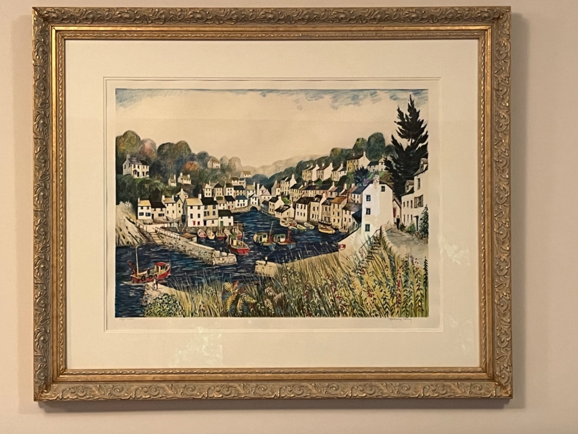 The item is a limited print titled “Serene Riverside” by Jeremy King. It features a tranquil riverside scene with houses nestled among lush greenery, boats moored in the blue river, and a prominent red boat with a figure inside in the foreground. The sky suggests either dawn or dusk, adding to the serene atmosphere. The print is framed in an ornate gold-painted wooden frame with intricate detailing. Jeremy King is known for capturing British rural and coastal scenes, often reflecting historical settings through architectural styles.