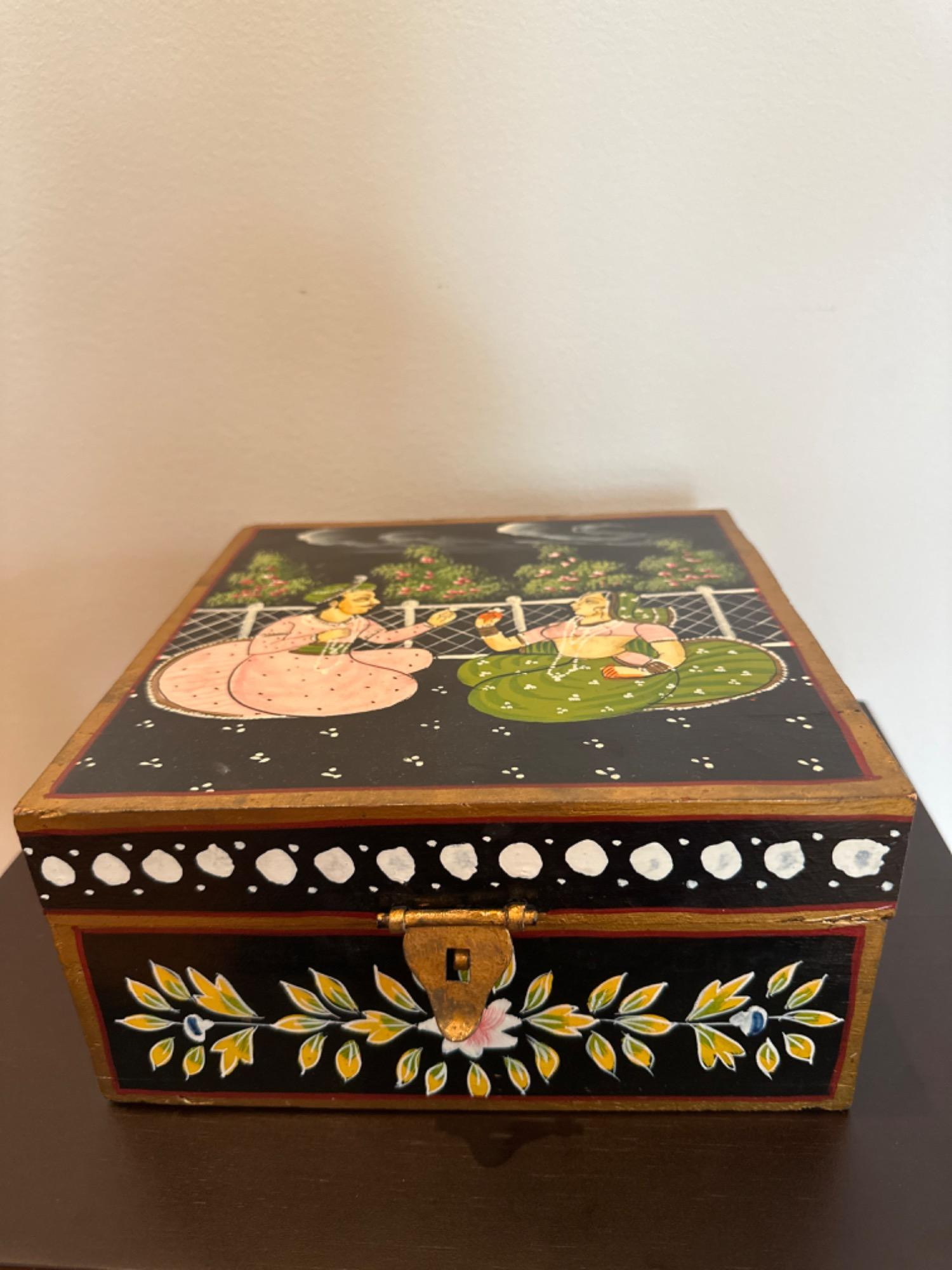 “Hand-Painted Traditional East Indian Scene Wooden Box” Hand-painted scene depicting traditional East Indian figures and a natural backdrop. Made of wood with detailed painted artwork. Intricate designs along the sides and front, including floral patterns and borders. Elaborate East Indian Hand Painted Scene Wood Box. Hinged wood box with brass pullover clasp. age unknown. 9 x 9 x 4.5